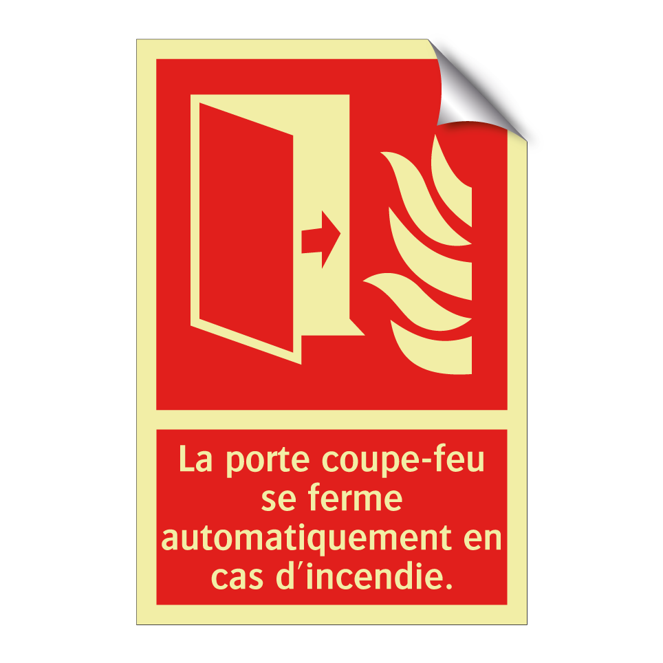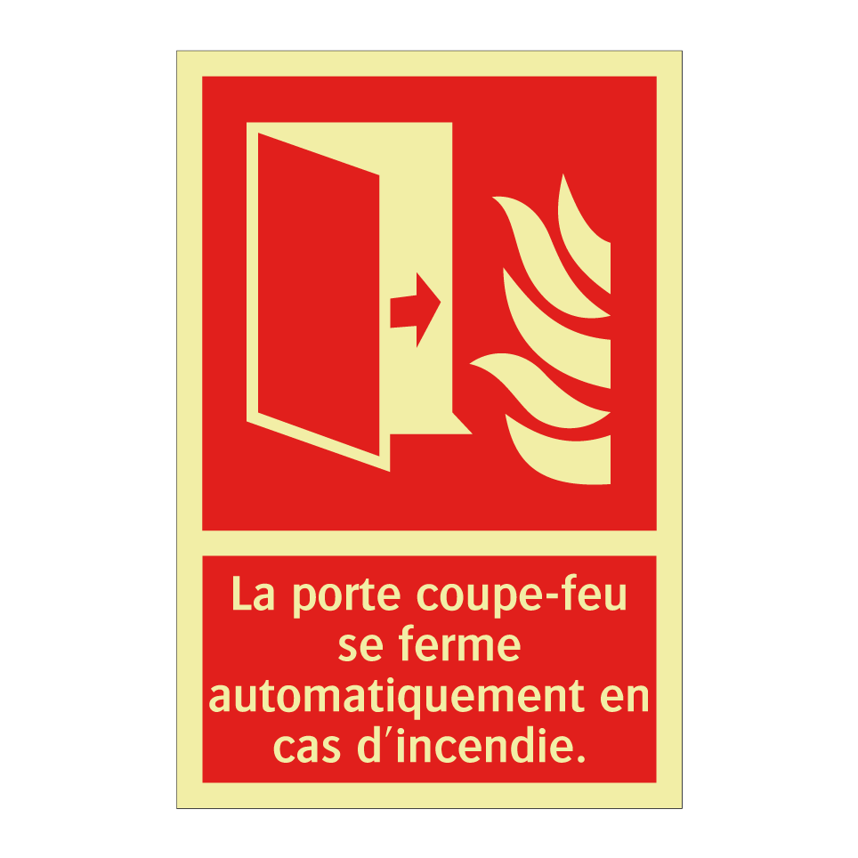 Panneau incendie avec le texte La porte coupe-feu se ferme automatiquement en cas d'incendie. et une symbolique claire