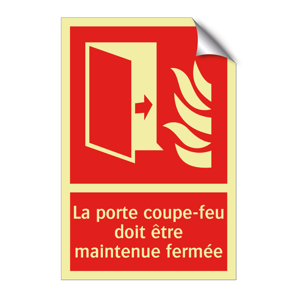 Panneau incendie avec le texte La porte coupe-feu doit être maintenue fermée et une symbolique claire