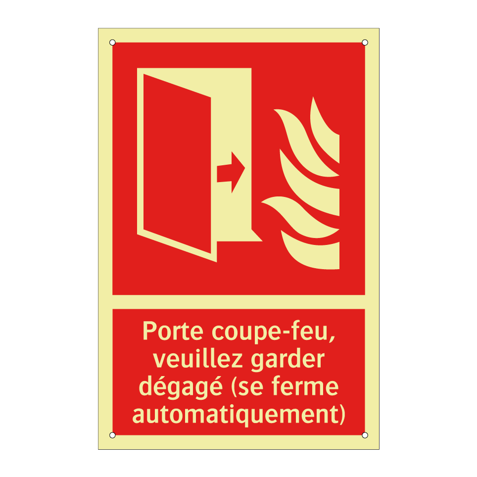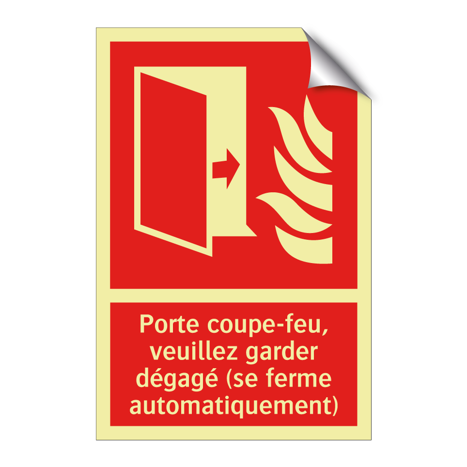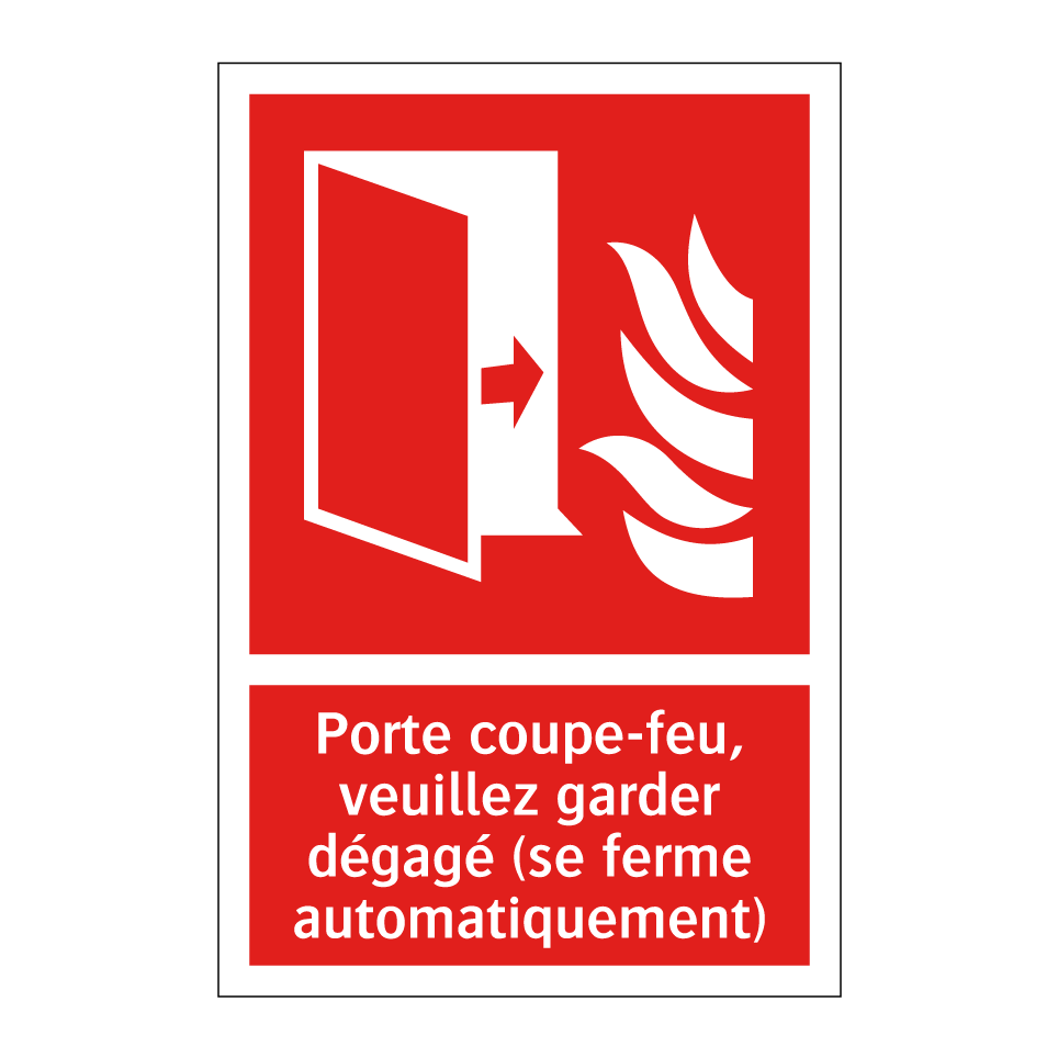 Panneau incendie avec le texte Porte coupe-feu, veuillez garder dégagé (se ferme automatiquement) et une symbolique claire