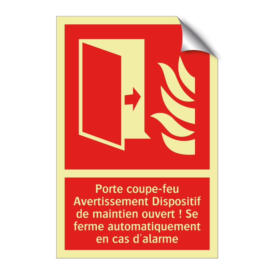 Panneau incendie avec le texte Porte coupe-feu Avertissement Dispositif de maintien ouvert ! Se ferme automatiquement en cas d'alarme et une symbolique claire