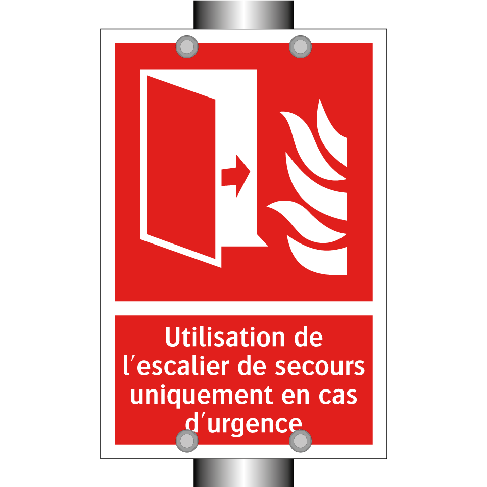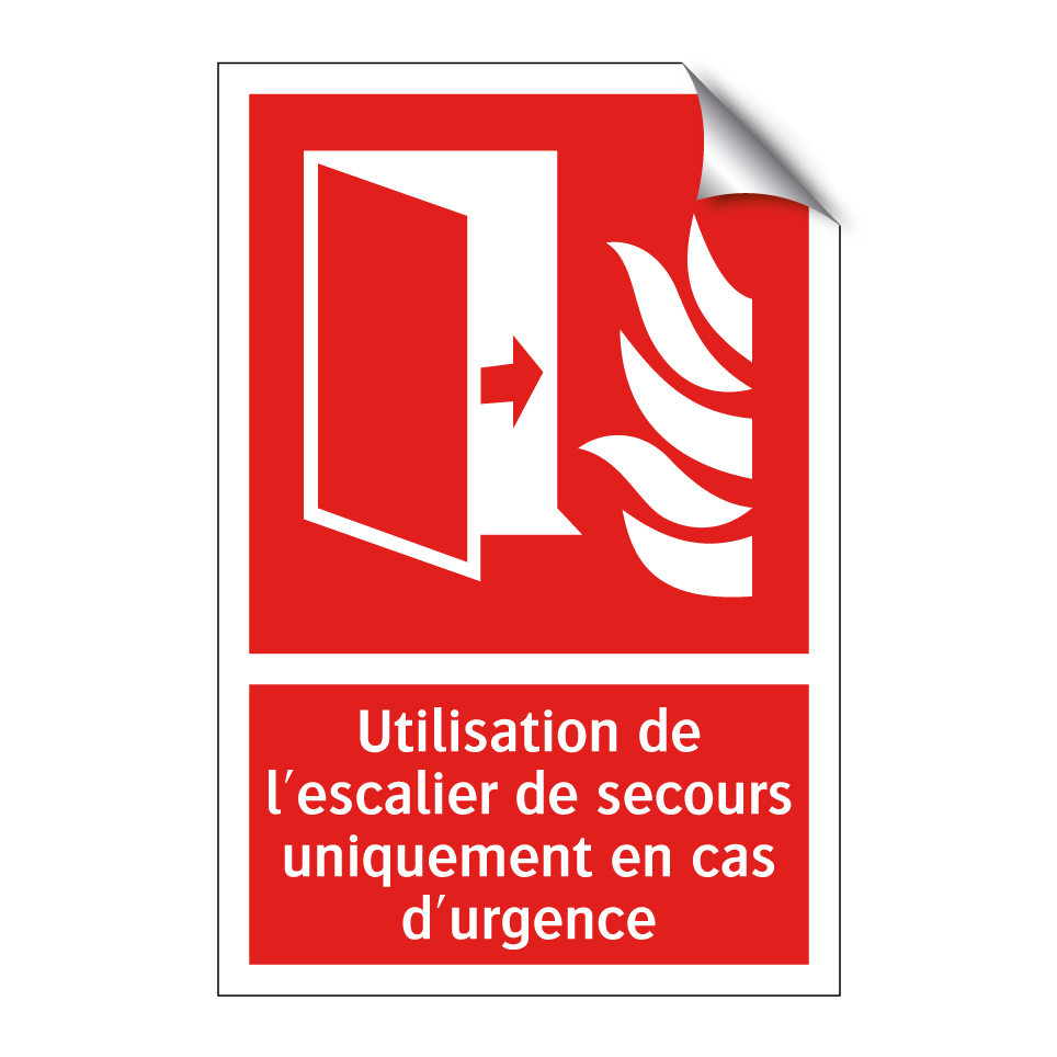 Panneau incendie avec le texte Utilisation de l'escalier de secours uniquement en cas d'urgence et une symbolique claire