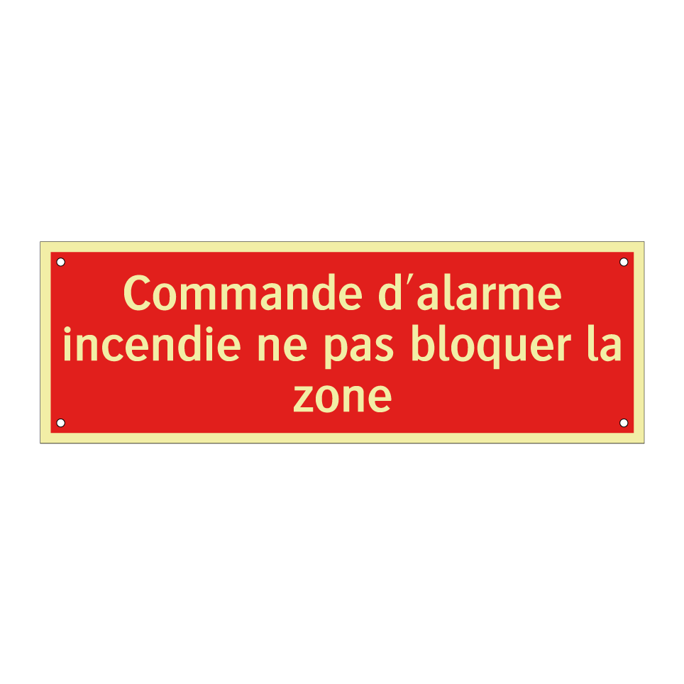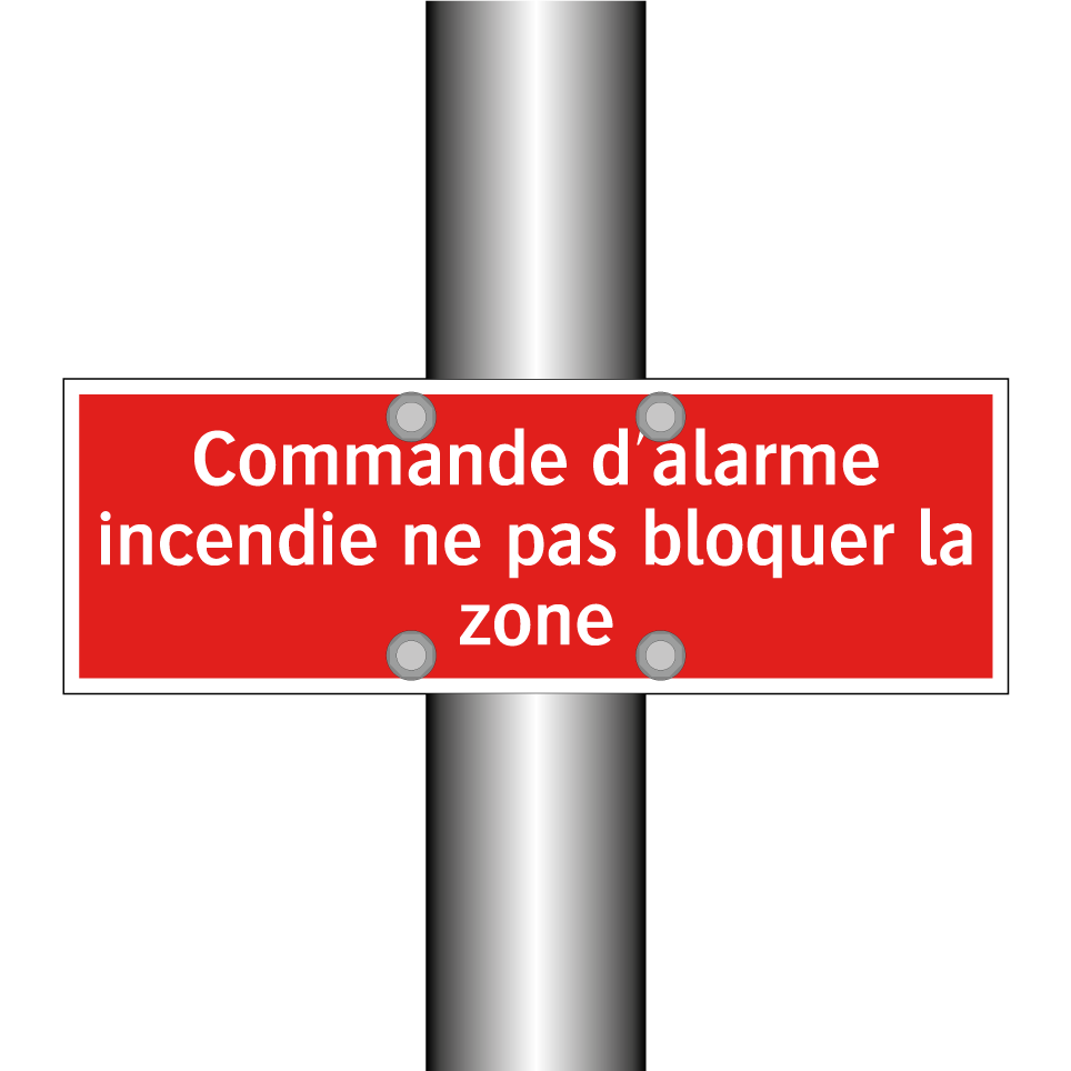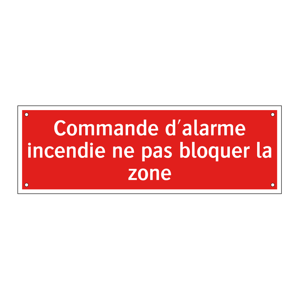 Panneau de signalisation incendie avec le texte Commande d'alarme incendie ne pas bloquer la zone