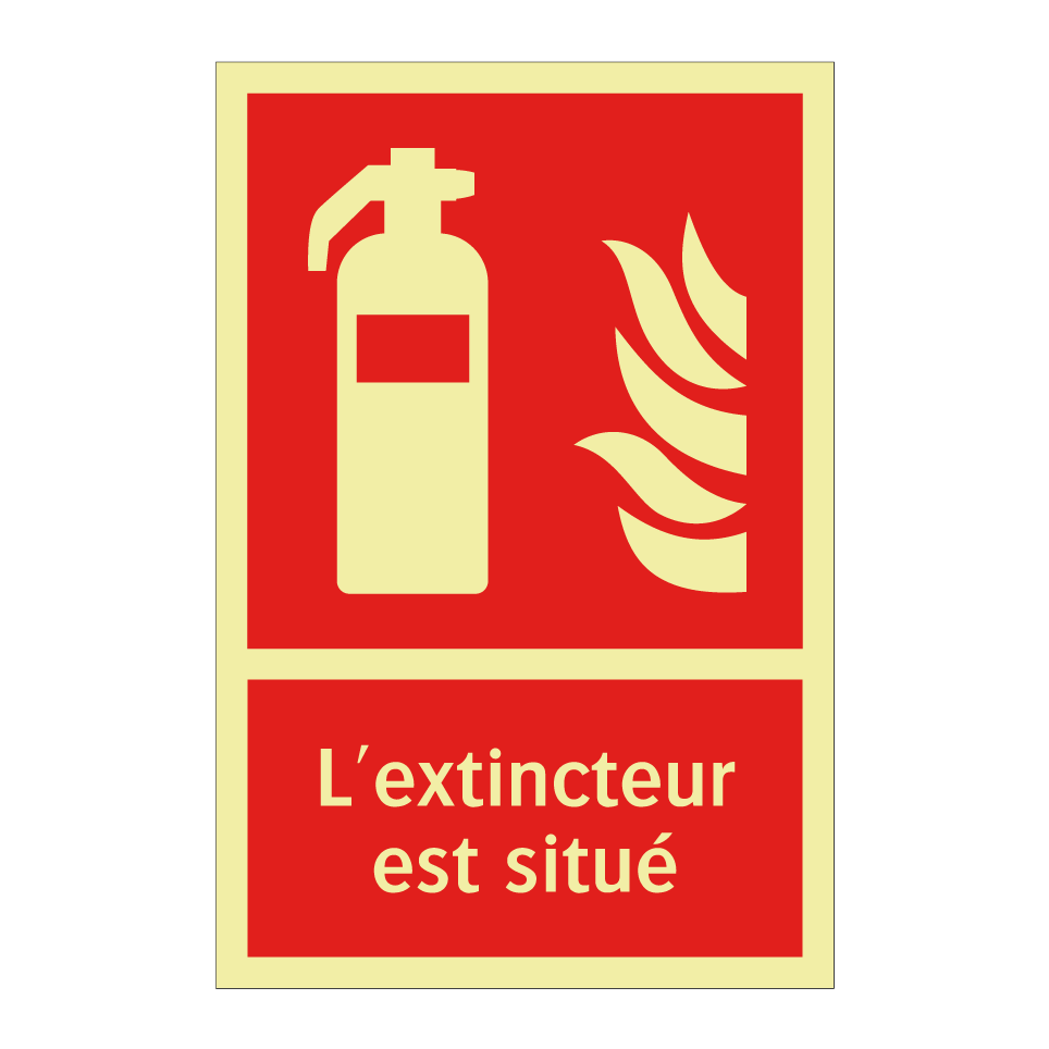 Panneau incendie avec le texte L'extincteur est situé et une symbolique claire