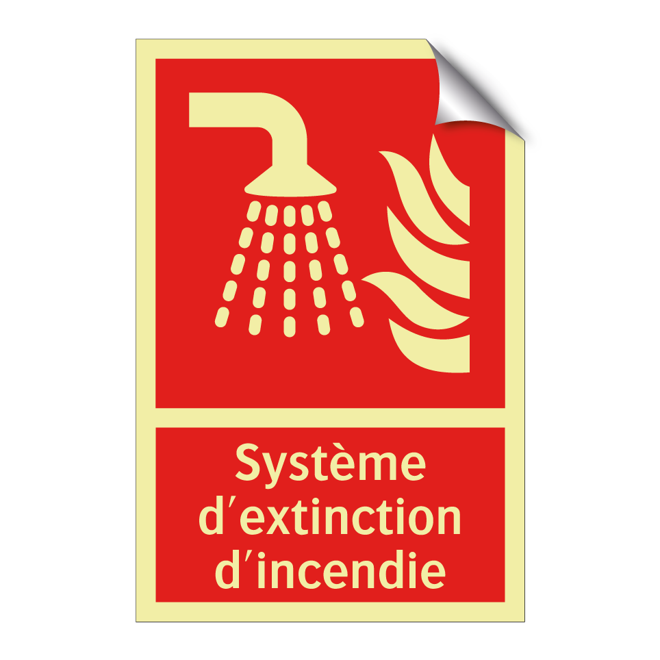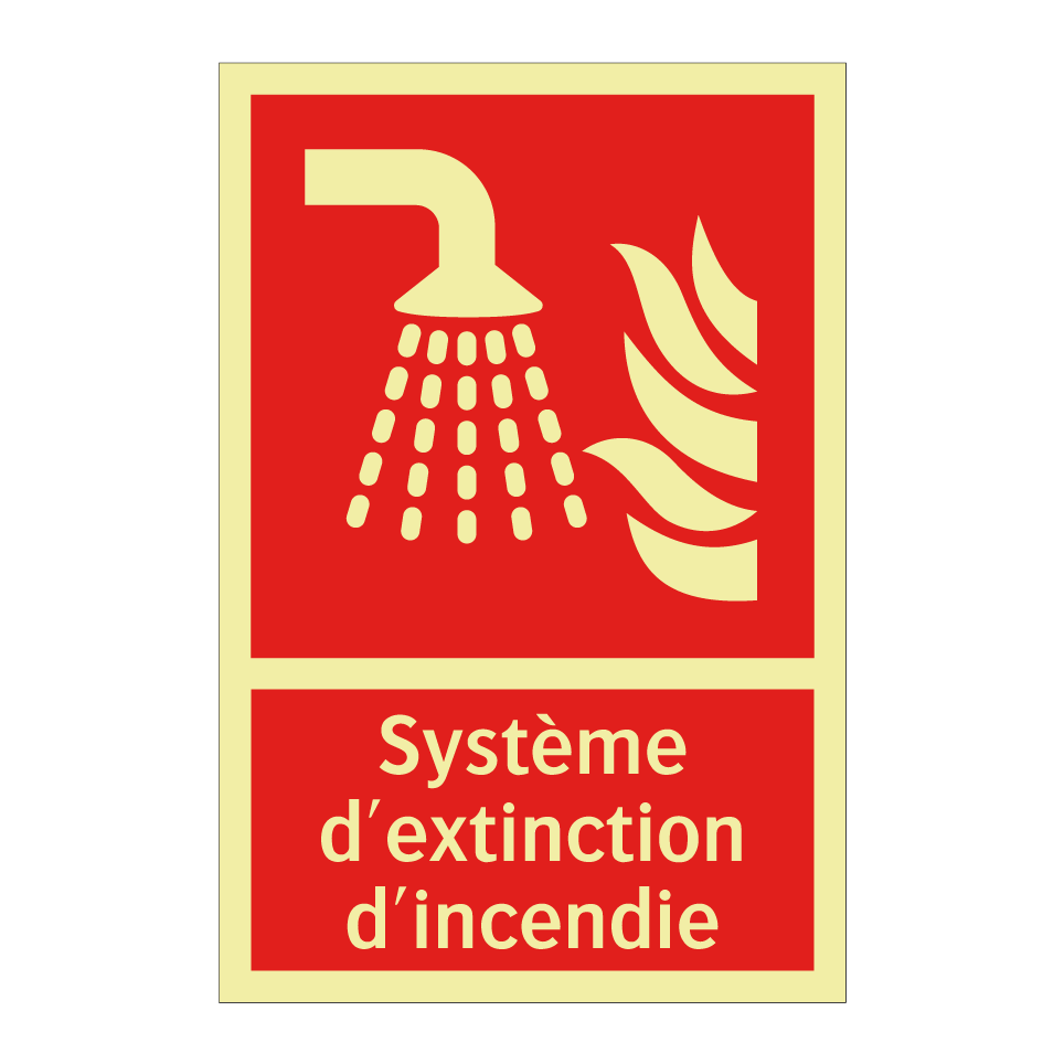 Panneau incendie avec le texte Système d'extinction d'incendie et une symbolique claire