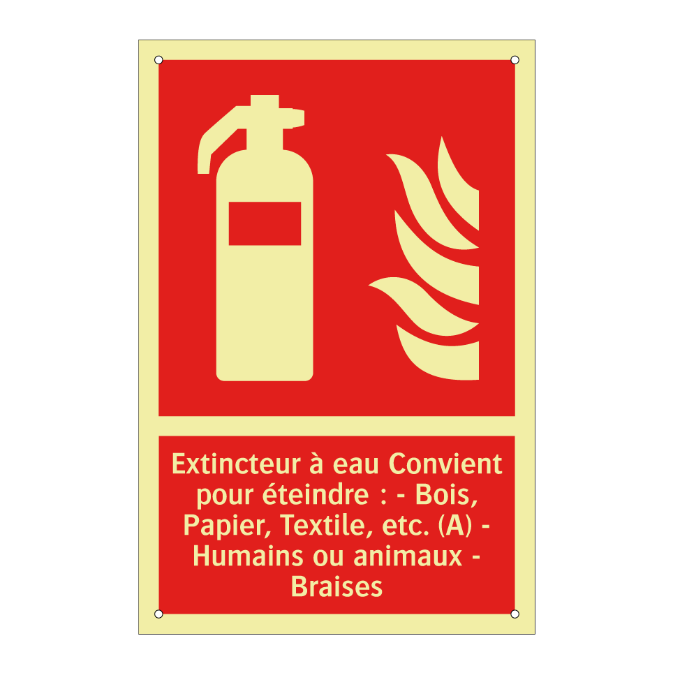 Panneau incendie avec le texte Extincteur à eau Convient pour éteindre : - Bois, Papier, Textile, etc. (A) - Humains ou animaux - Braises et une symbolique claire
