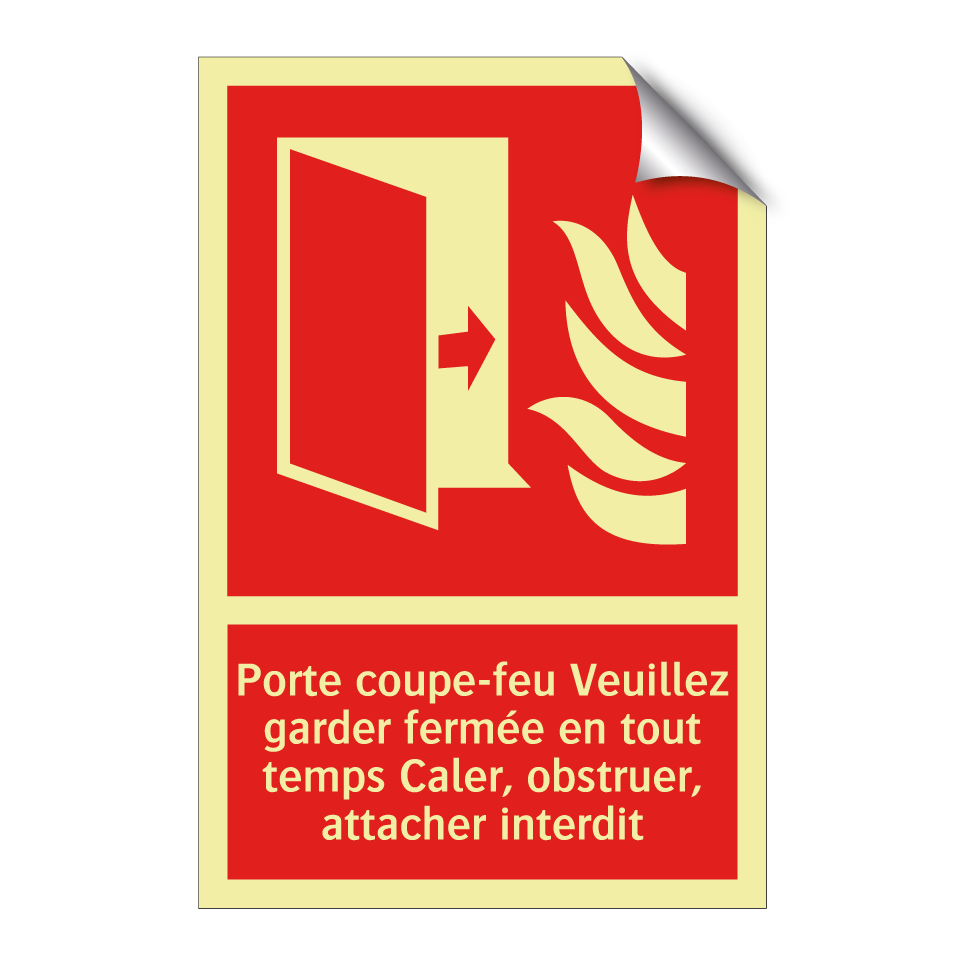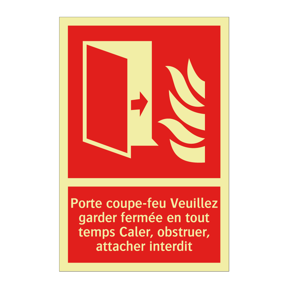 Panneau incendie avec le texte Porte coupe-feu Veuillez garder fermée en tout temps Caler, obstruer, attacher interdit et une symbolique claire