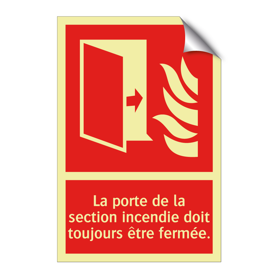Panneau incendie avec le texte La porte de la section incendie doit toujours être fermée. et une symbolique claire