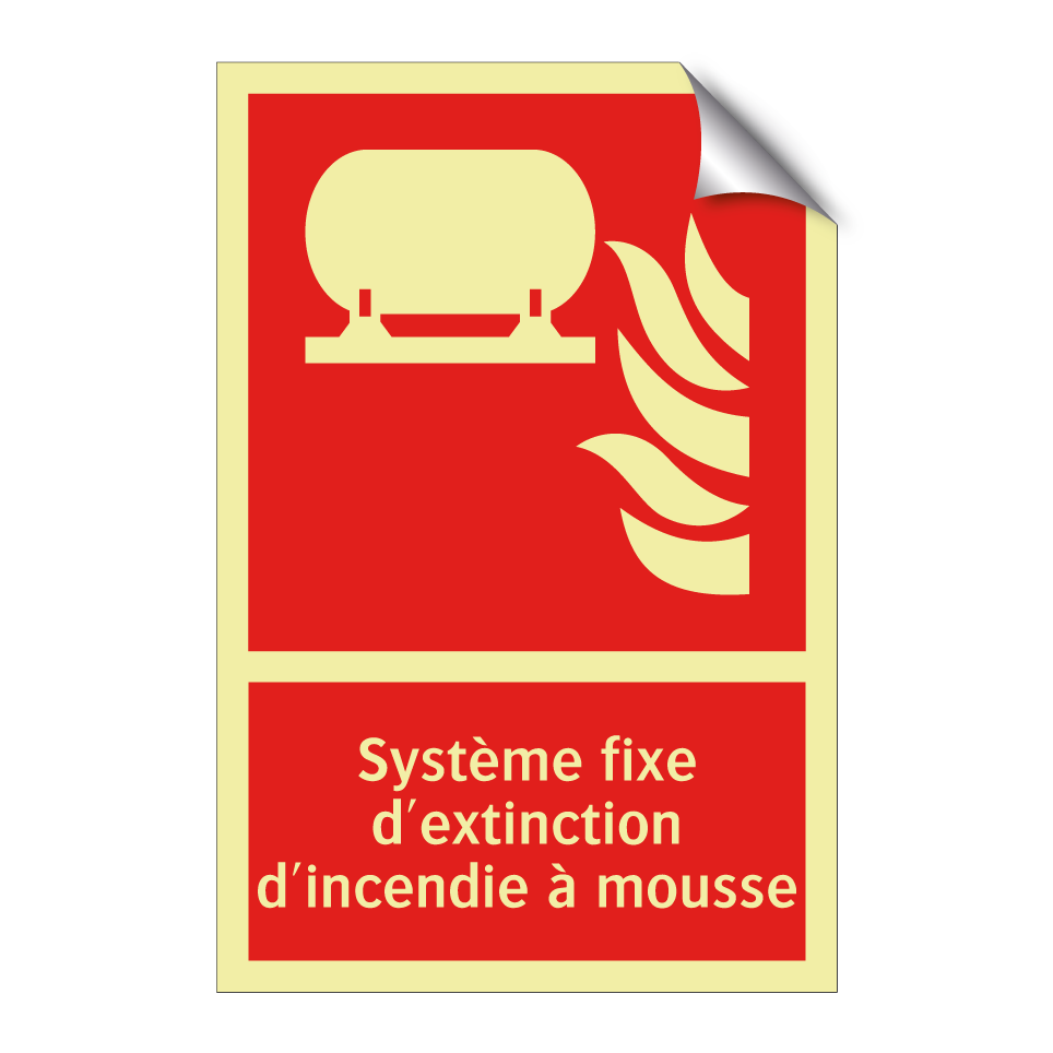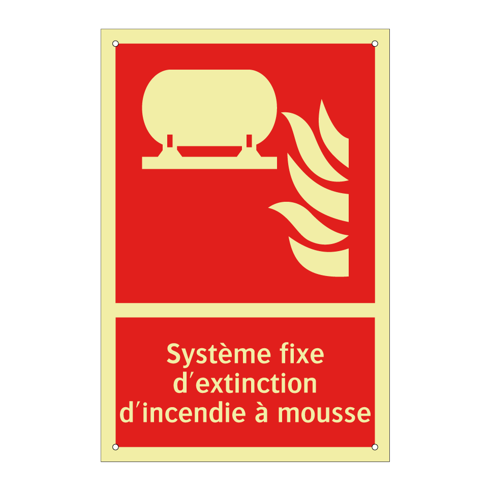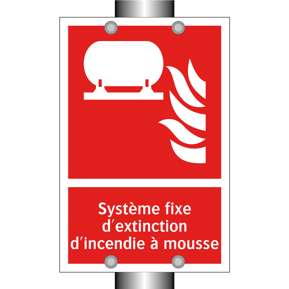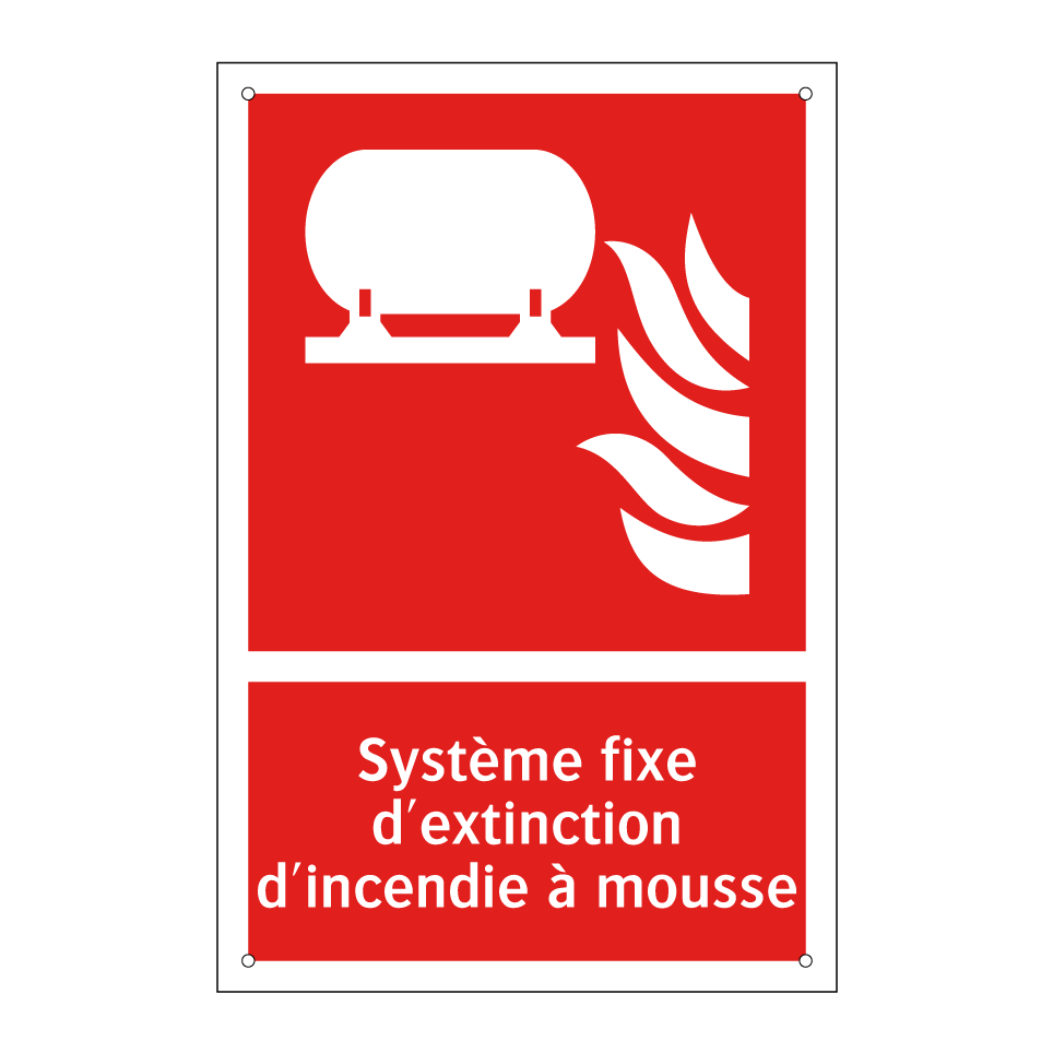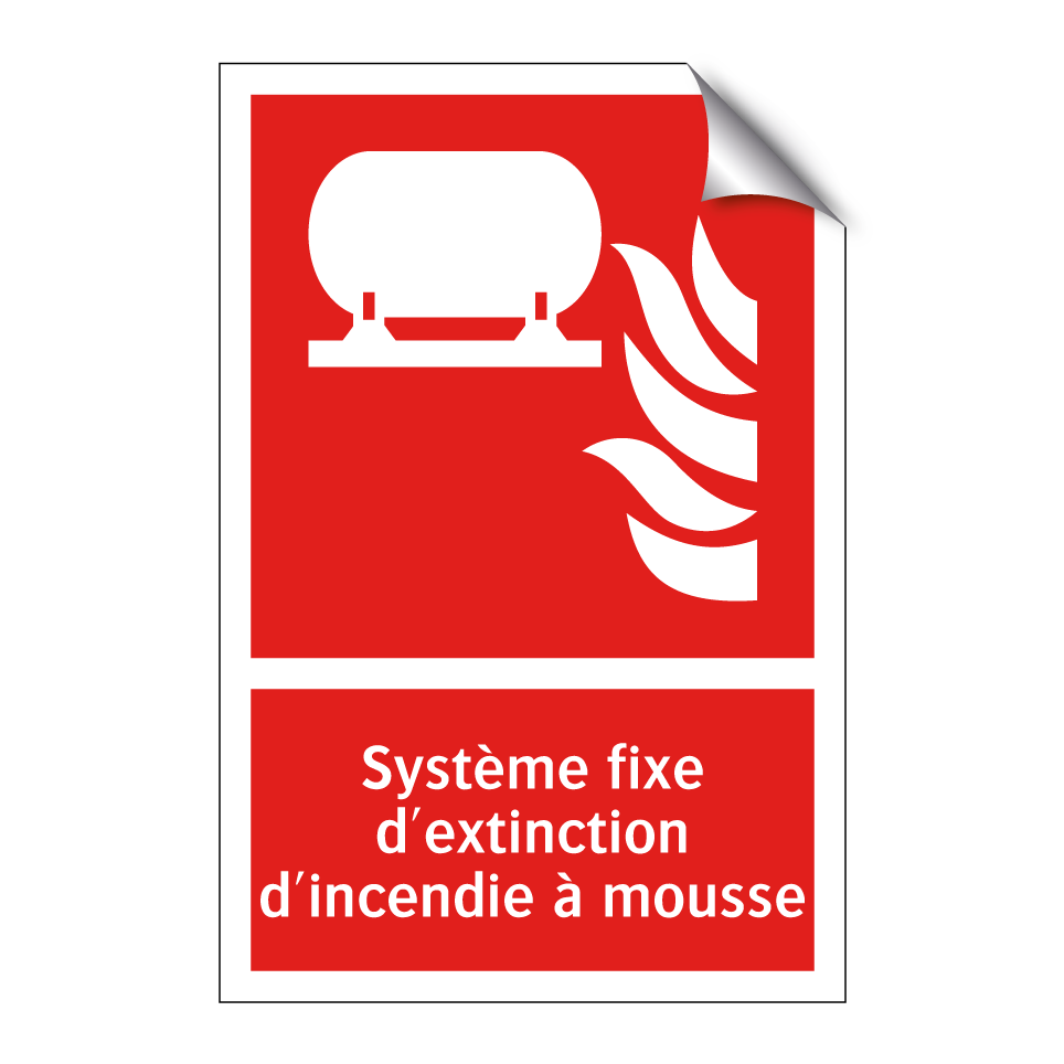 Panneau incendie avec le texte Système fixe d'extinction d'incendie à mousse et une symbolique claire