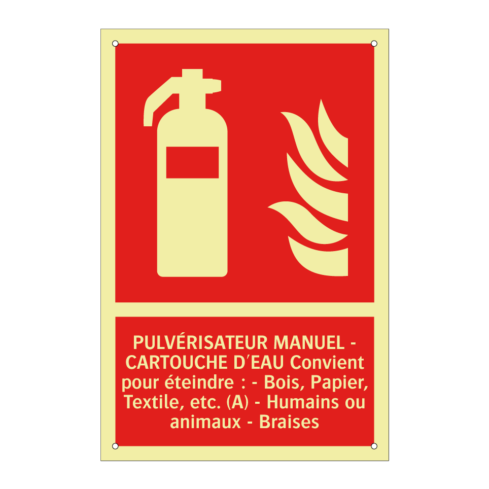 Panneau incendie avec le texte PULVÉRISATEUR MANUEL - CARTOUCHE D'EAU Convient pour éteindre : - Bois, Papier, Textile, etc. (A) - Humains ou animaux - Braises et une symbolique claire