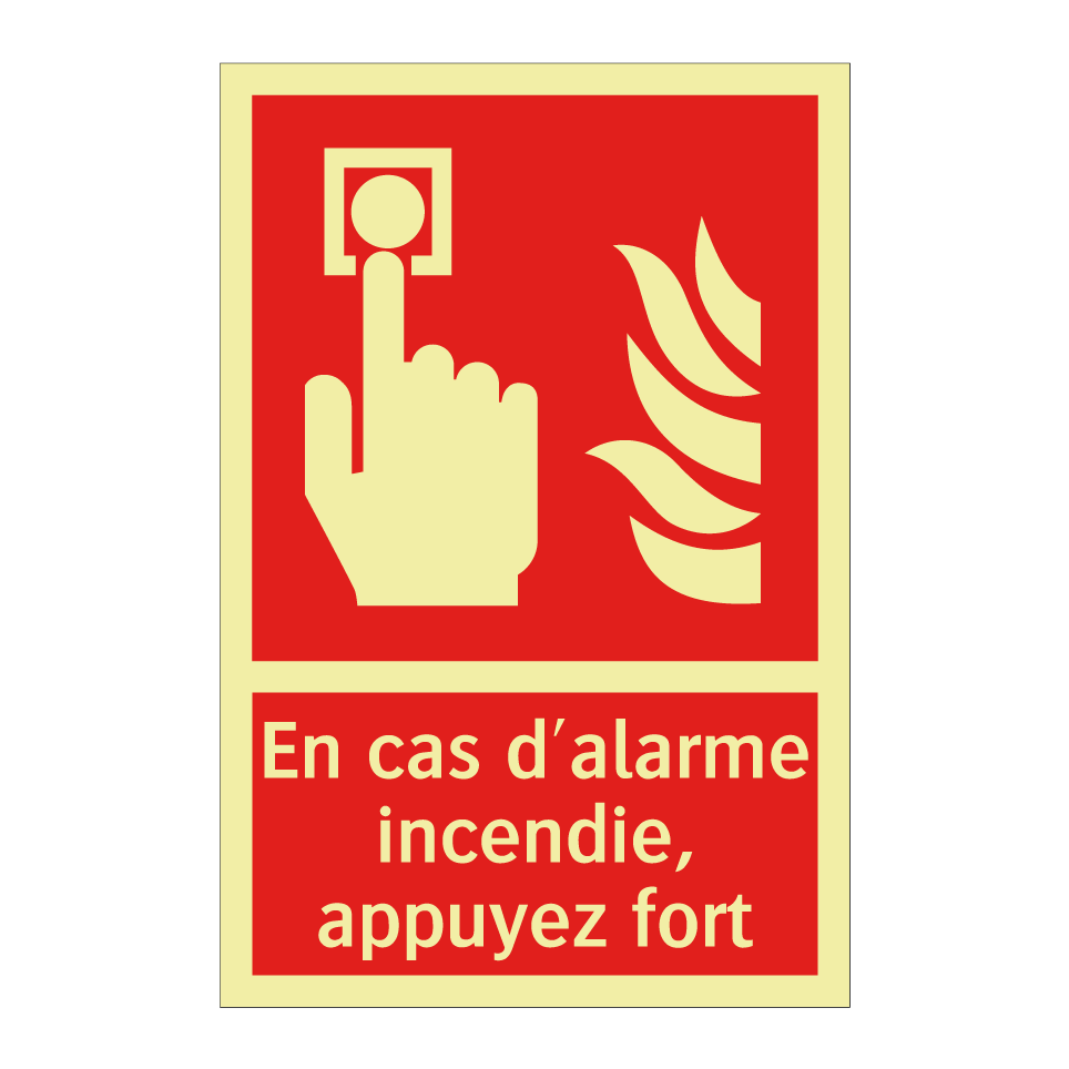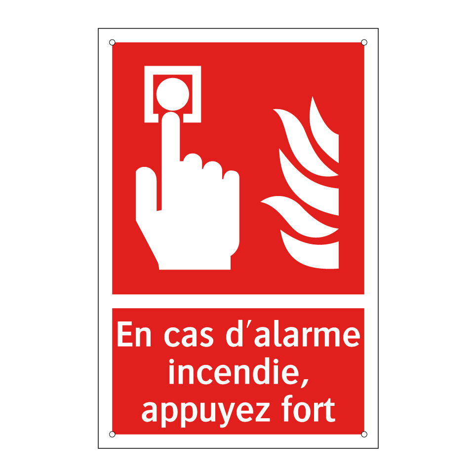 Panneau incendie avec le texte En cas d'alarme incendie, appuyez fort et une symbolique claire