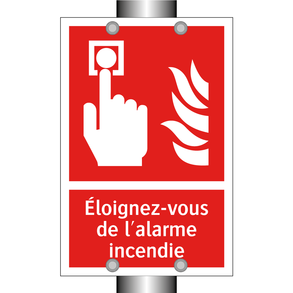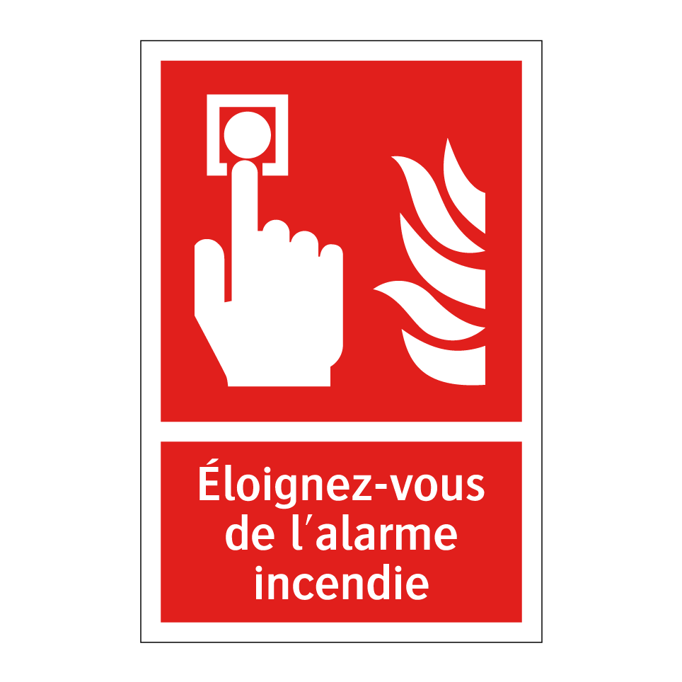 Panneau incendie avec le texte Éloignez-vous de l'alarme incendie et une symbolique claire