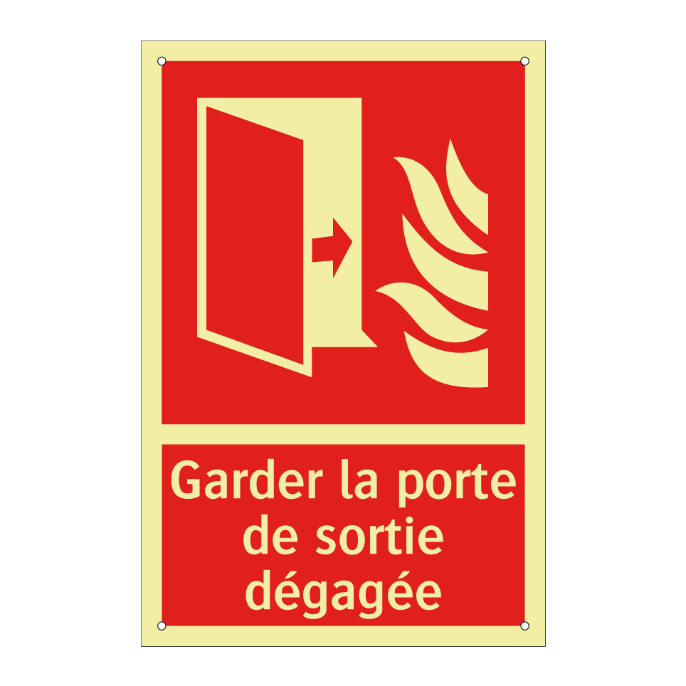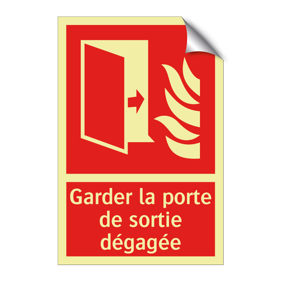 Panneau incendie avec le texte Garder la porte de sortie dégagée et une symbolique claire
