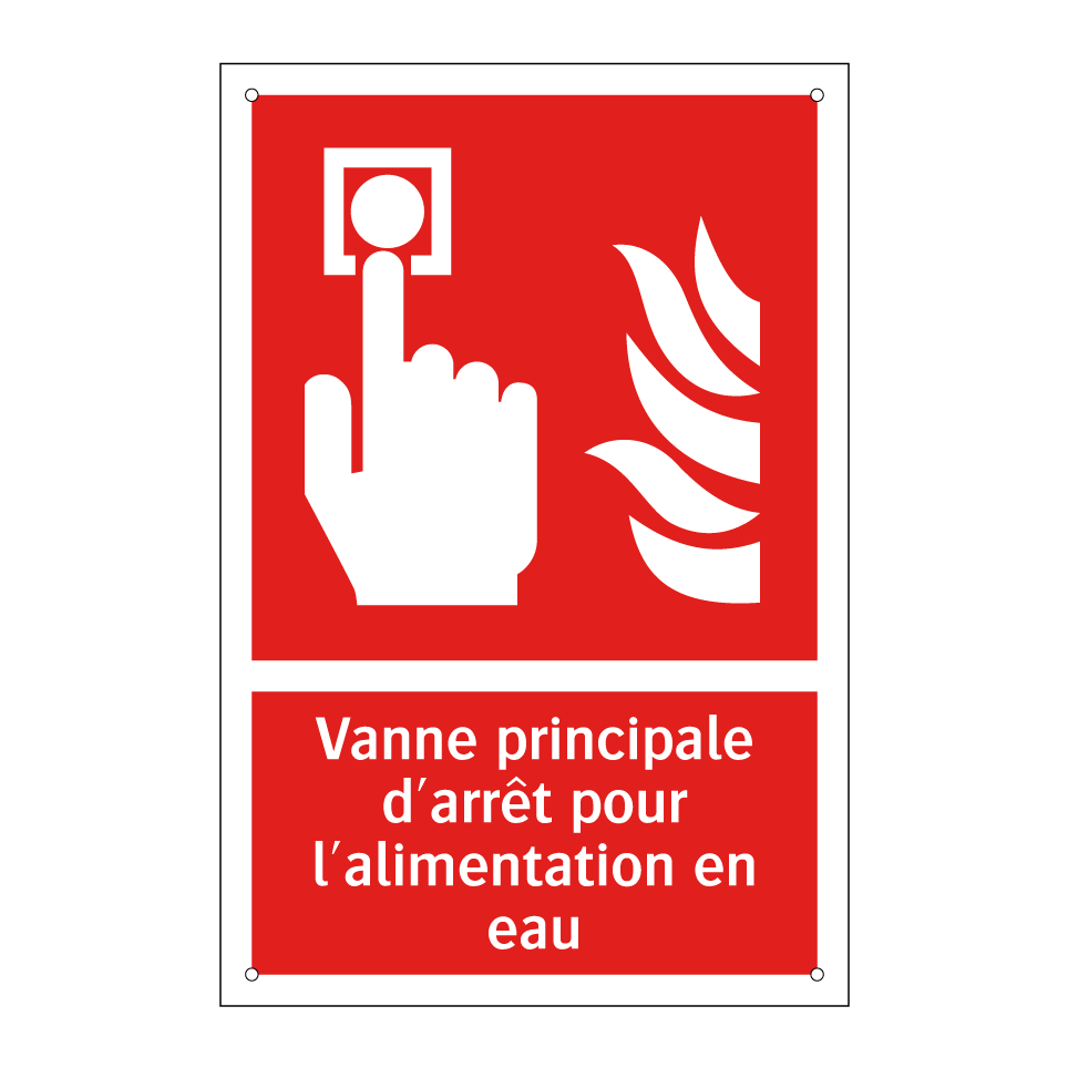 Panneau incendie avec le texte Vanne principale d'arrêt pour l'alimentation en eau et une symbolique claire