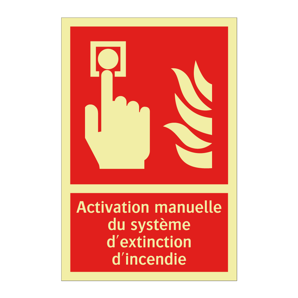 Panneau incendie avec le texte Activation manuelle du système d'extinction d'incendie et une symbolique claire