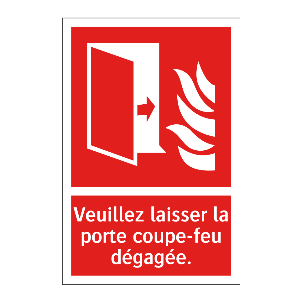 Panneau incendie avec le texte Veuillez laisser la porte coupe-feu dégagée. et une symbolique claire