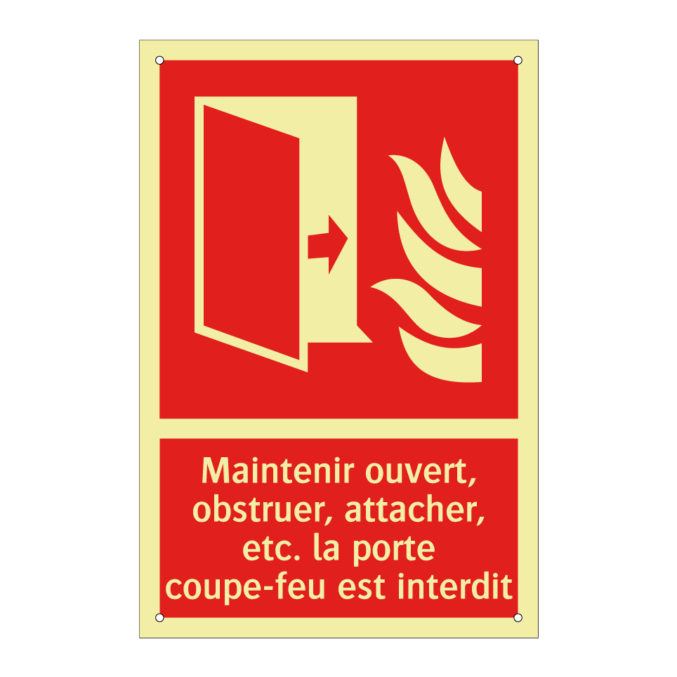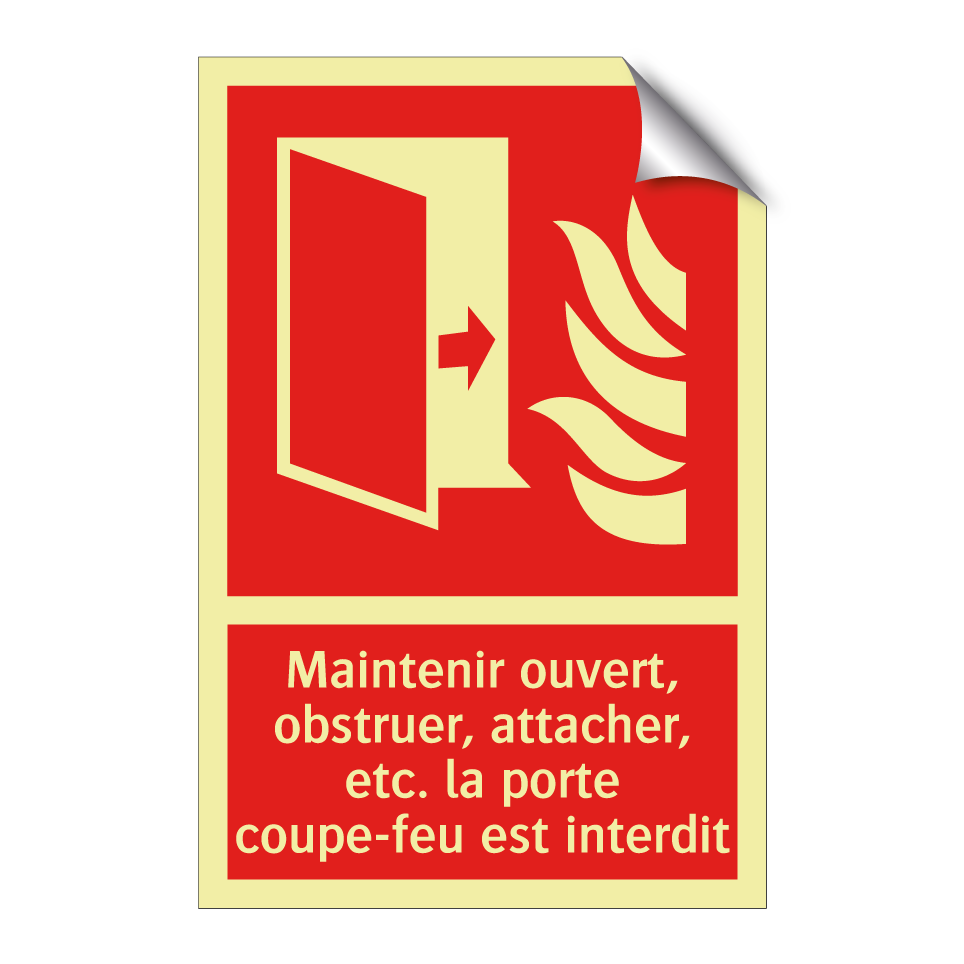 Panneau incendie avec le texte Maintenir ouvert, obstruer, attacher, etc. la porte coupe-feu est interdit et une symbolique claire