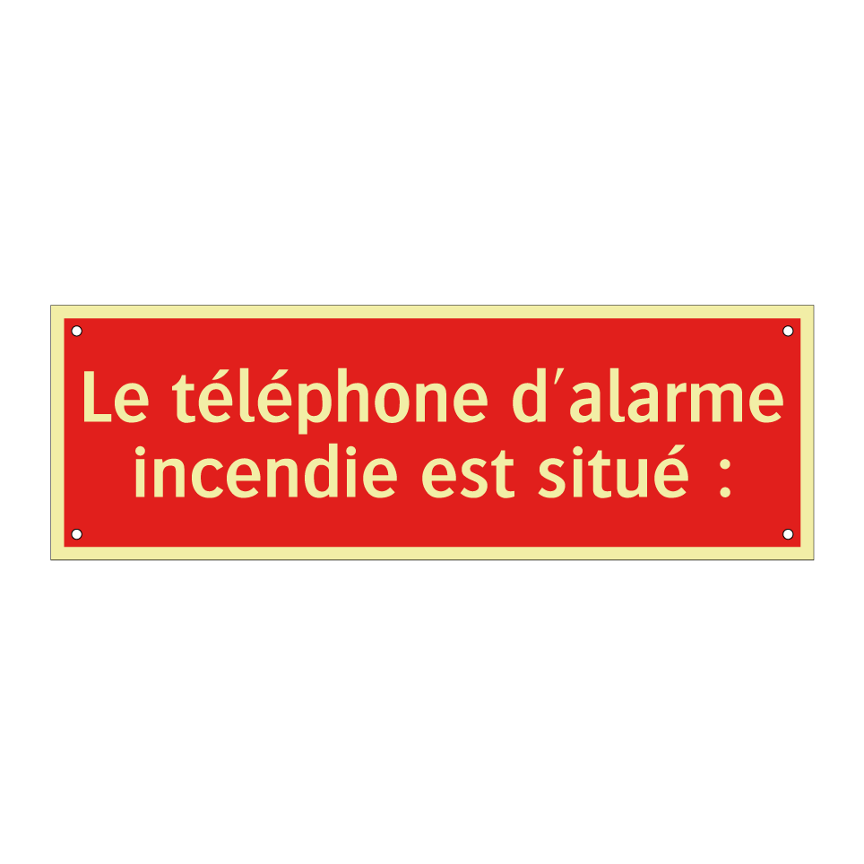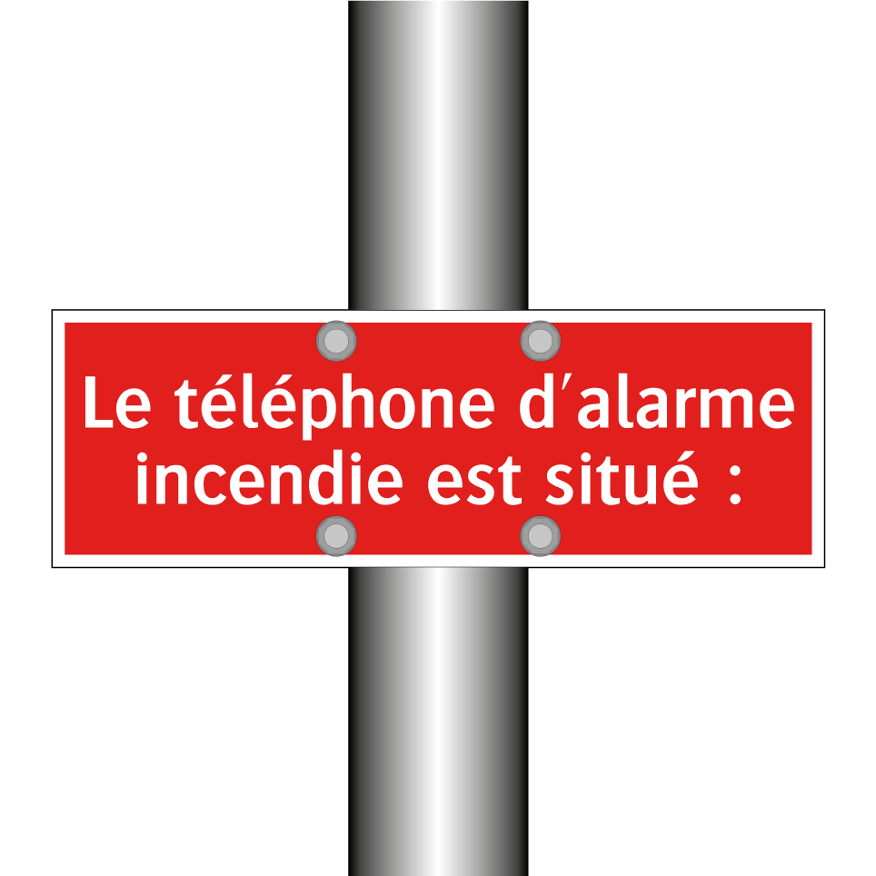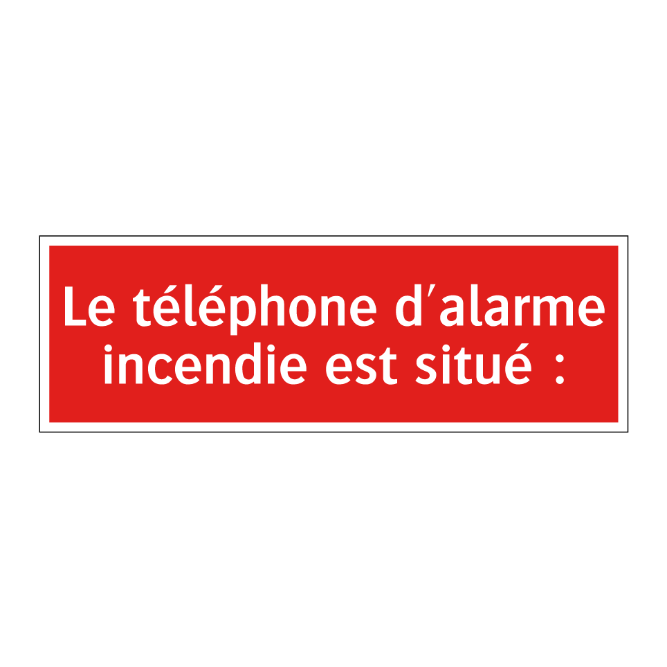 Panneau de signalisation incendie avec le texte Le téléphone d'alarme incendie est situé :