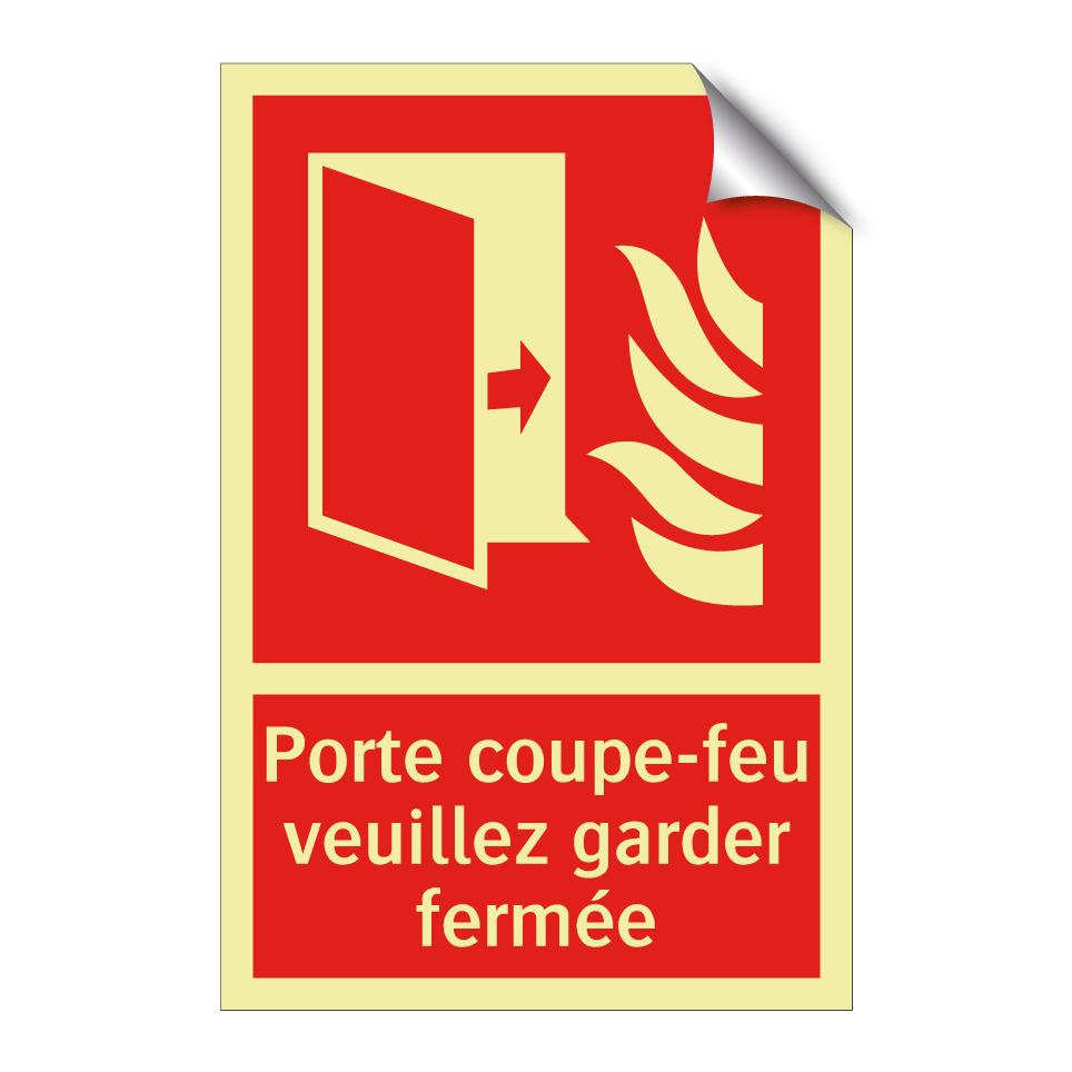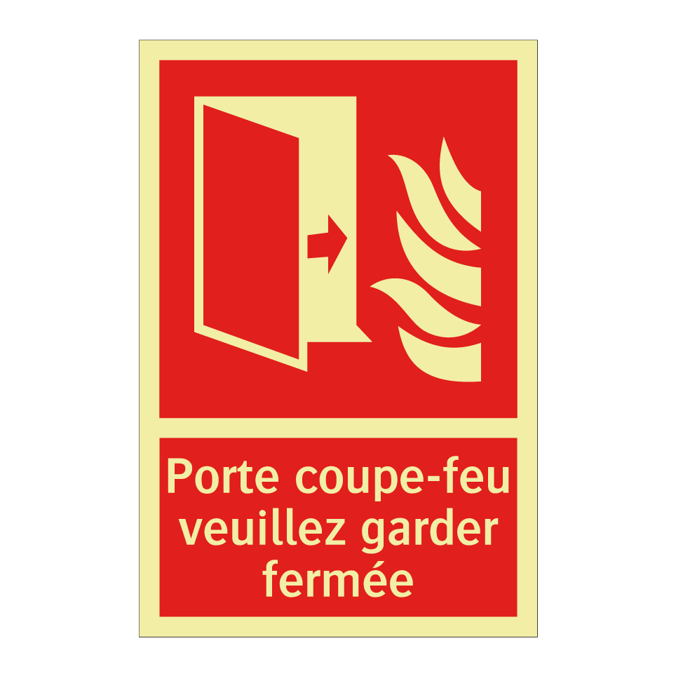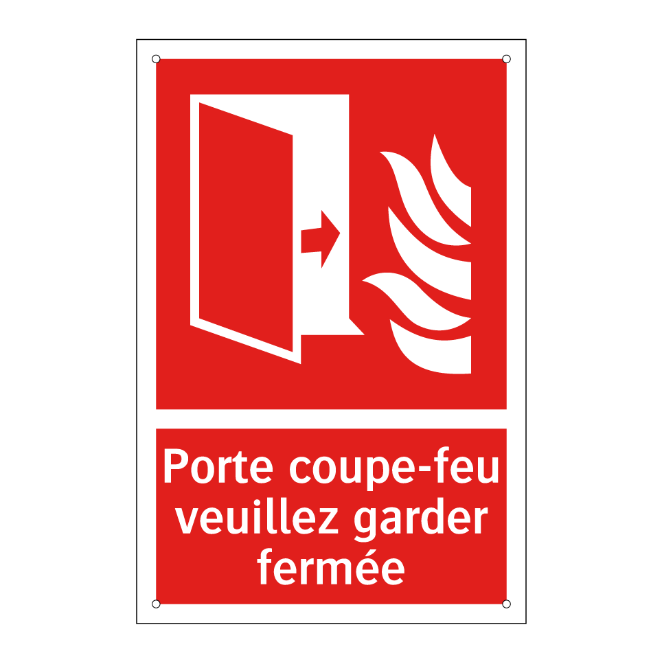 Panneau incendie avec le texte Porte coupe-feu veuillez garder fermée et une symbolique claire