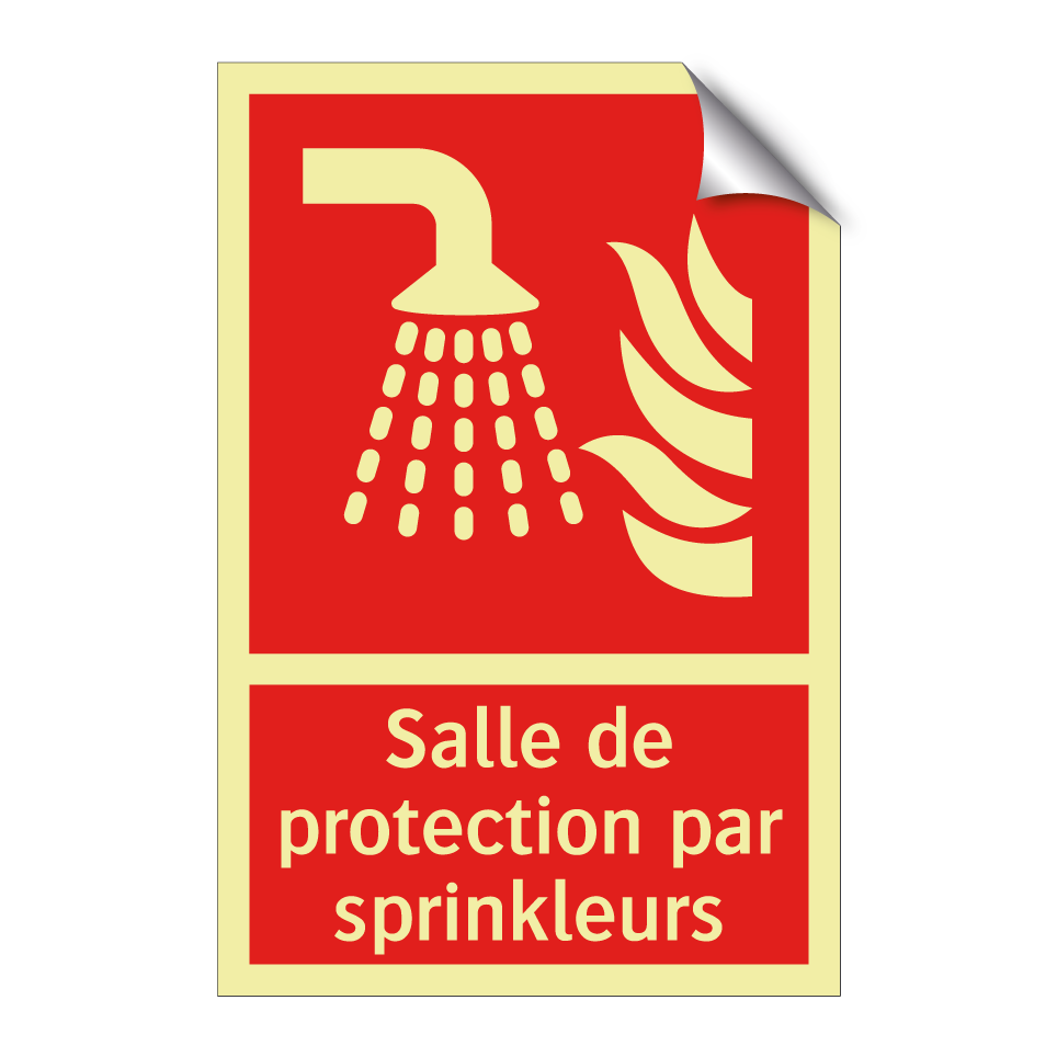 Panneau incendie avec le texte Salle de protection par sprinkleurs et une symbolique claire