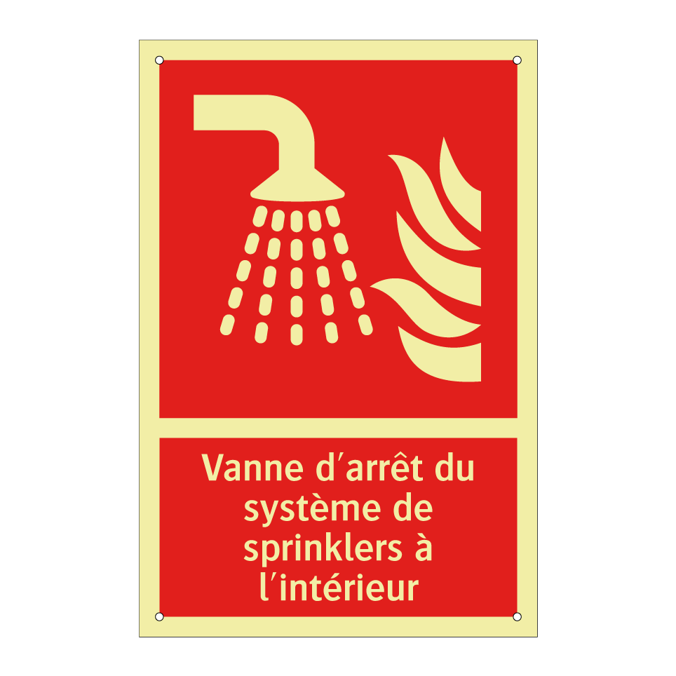 Panneau incendie avec le texte Vanne d'arrêt du système de sprinklers à l'intérieur et une symbolique claire