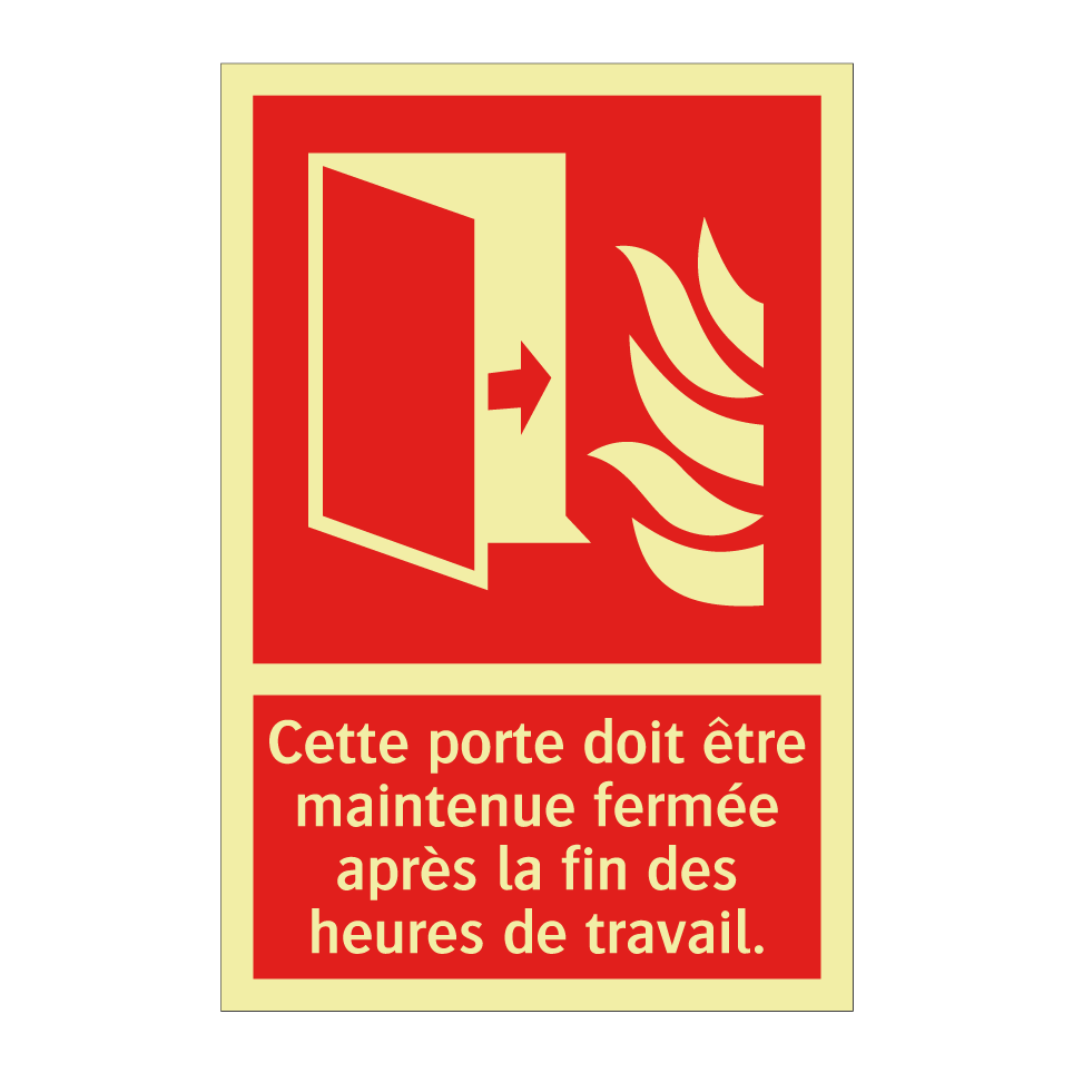 Panneau incendie avec le texte Cette porte doit être maintenue fermée après la fin des heures de travail. et une symbolique claire