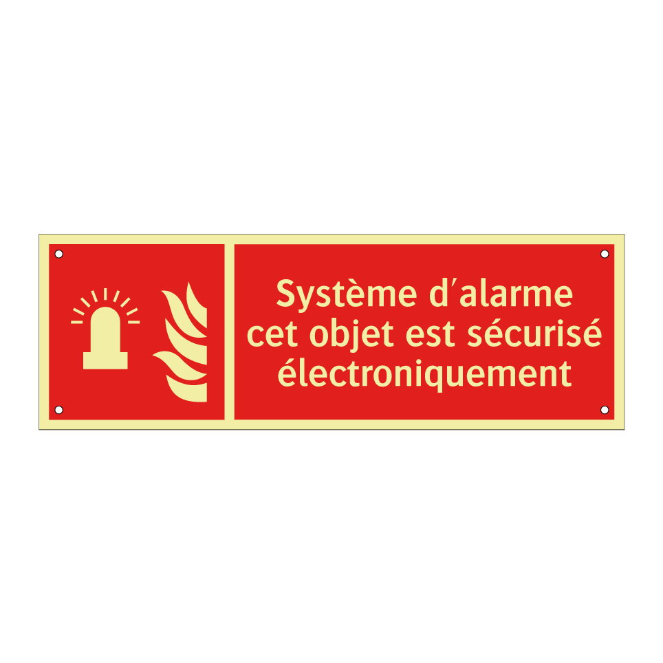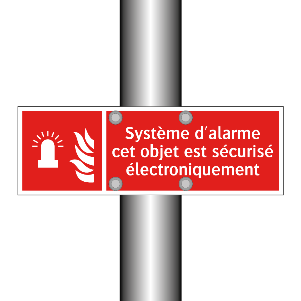 Panneau incendie avec le texte Système d'alarme cet objet est sécurisé électroniquement et une symbolique claire