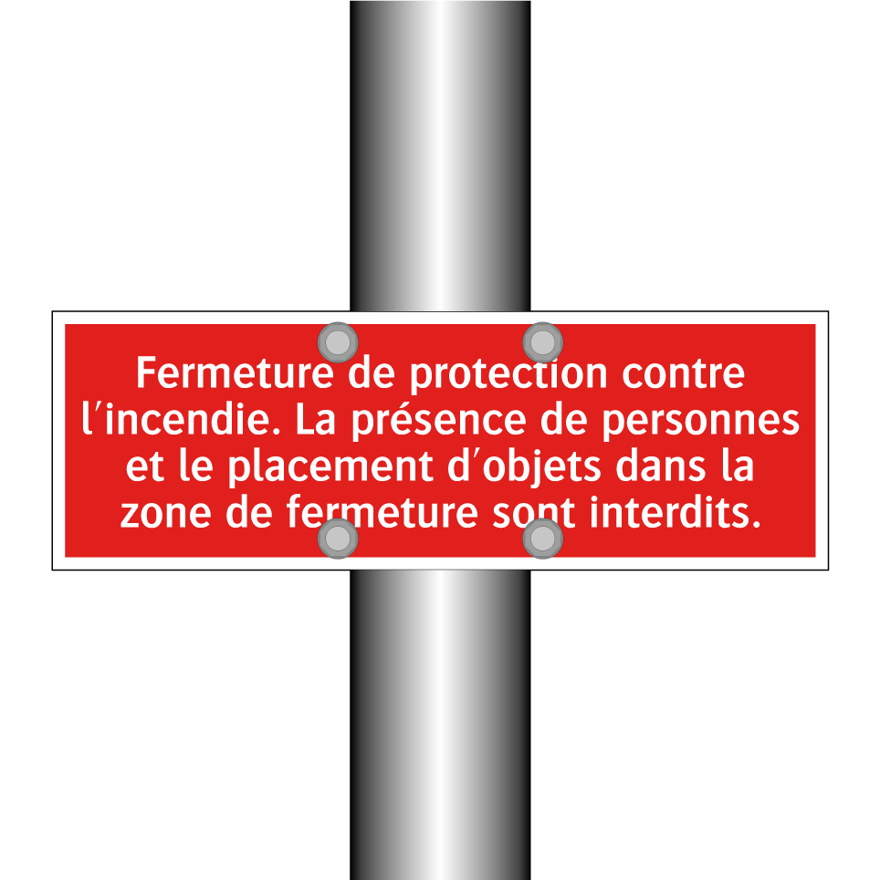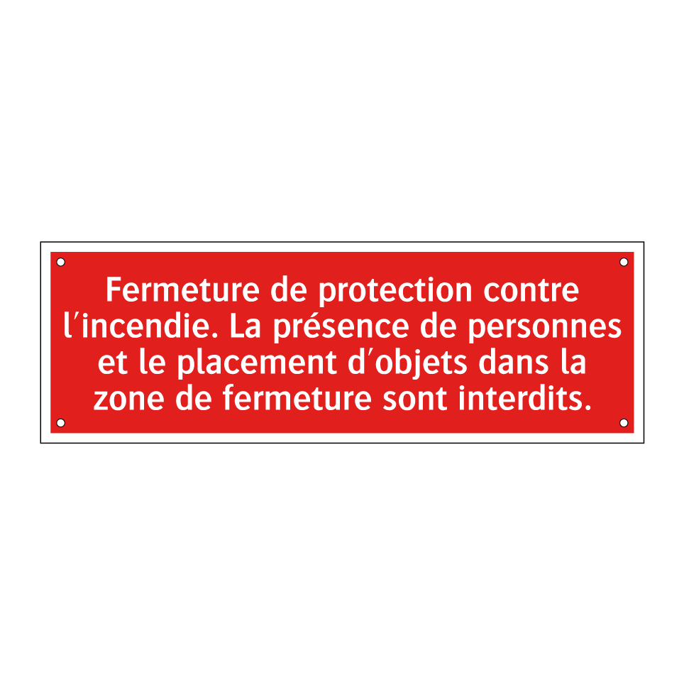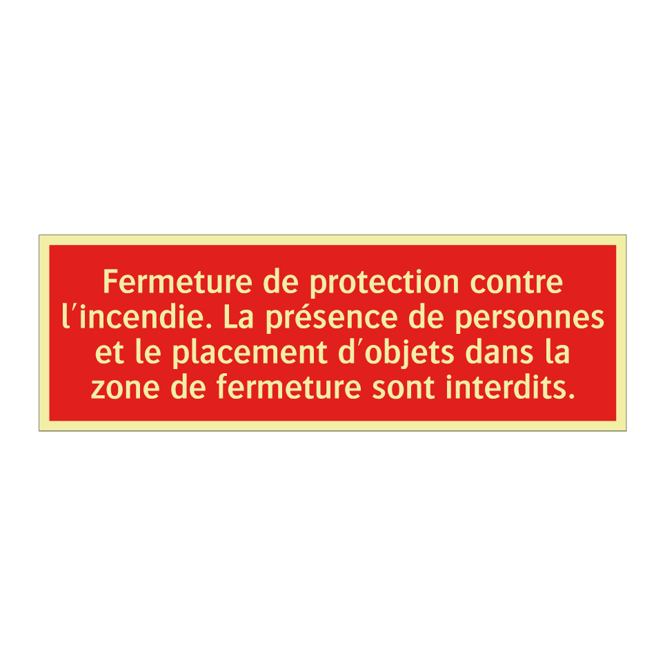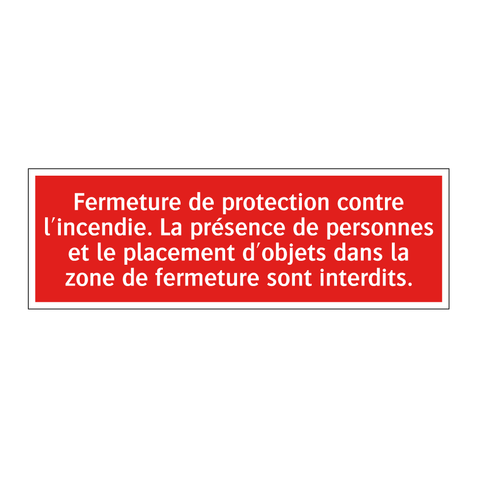 Panneau de signalisation incendie avec le texte Fermeture de protection contre l'incendie. La présence de personnes et le placement d'objets dans la zone de fermeture sont interdits.