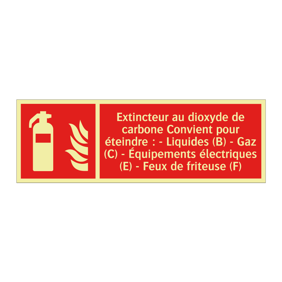 Panneau incendie avec le texte Extincteur au dioxyde de carbone Convient pour éteindre : - Liquides (B) - Gaz (C) - Équipements électriques (E) - Feux de friteuse (F) et une symbolique claire