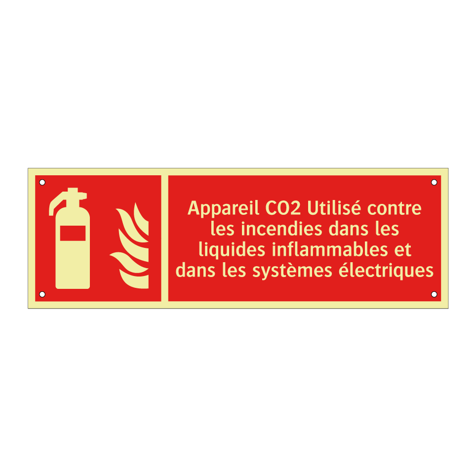 Panneau incendie avec le texte Appareil CO2 Utilisé contre les incendies dans les liquides inflammables et dans les systèmes électriques et une symbolique claire