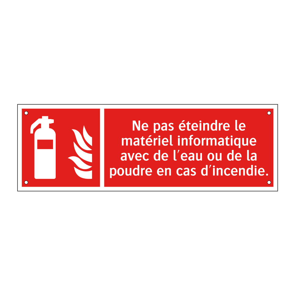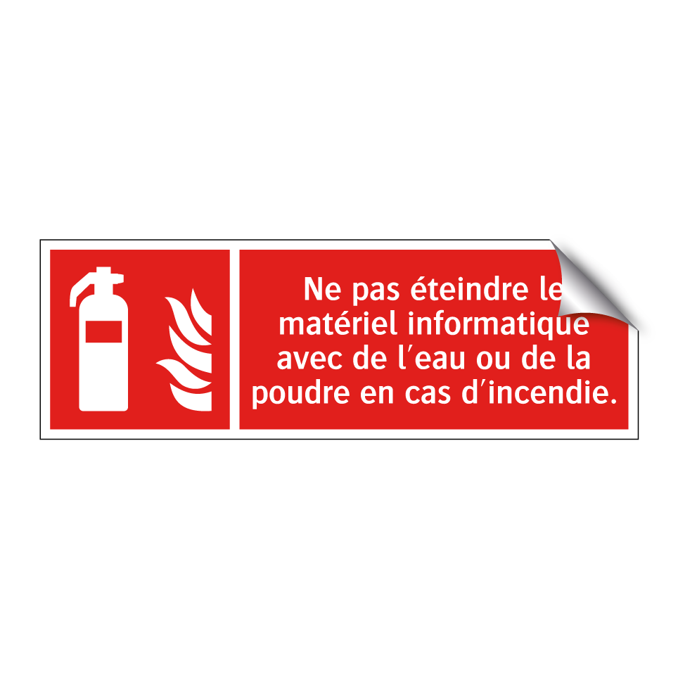 Panneau incendie avec le texte Ne pas éteindre le matériel informatique avec de l'eau ou de la poudre en cas d'incendie. et une symbolique claire