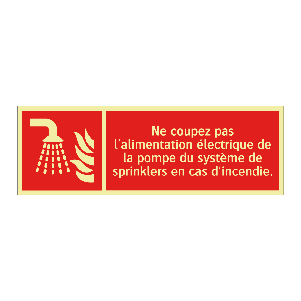 Panneau incendie avec le texte Ne coupez pas l'alimentation électrique de la pompe du système de sprinklers en cas d'incendie. et une symbolique claire