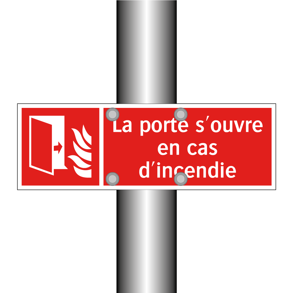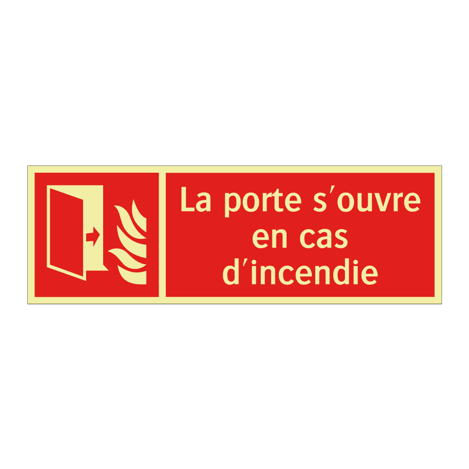 Panneau incendie avec le texte La porte s'ouvre en cas d'incendie et une symbolique claire