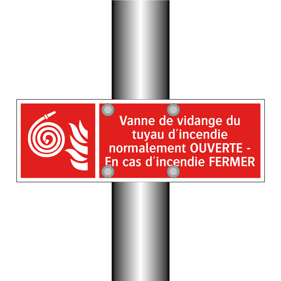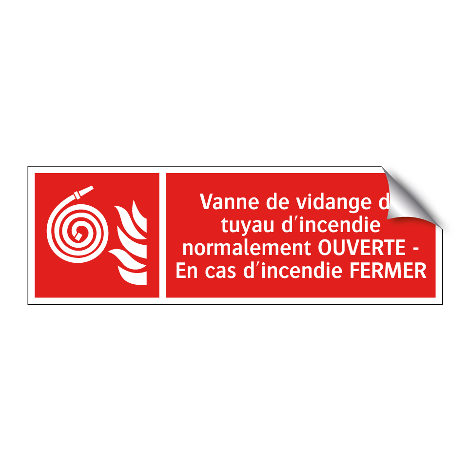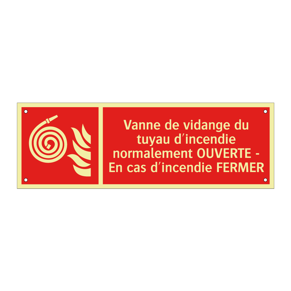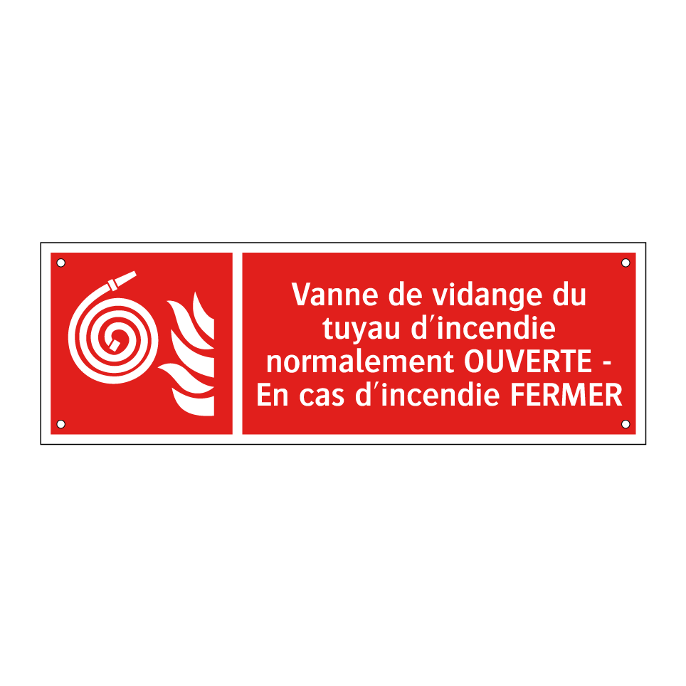 Panneau incendie avec le texte Vanne de vidange du tuyau d'incendie normalement OUVERTE - En cas d'incendie FERMER et une symbolique claire