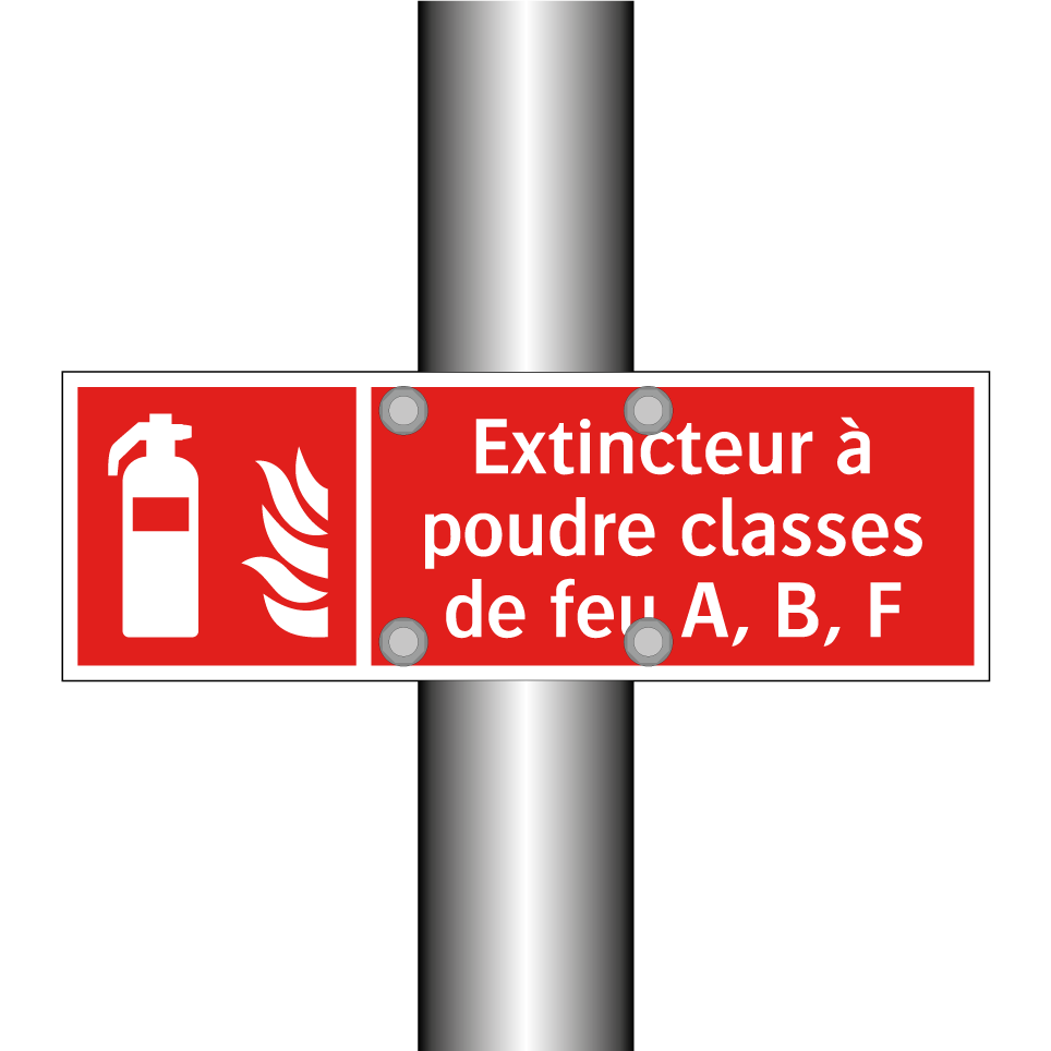 Panneau incendie avec le texte Extincteur à poudre classes de feu A, B, F et une symbolique claire