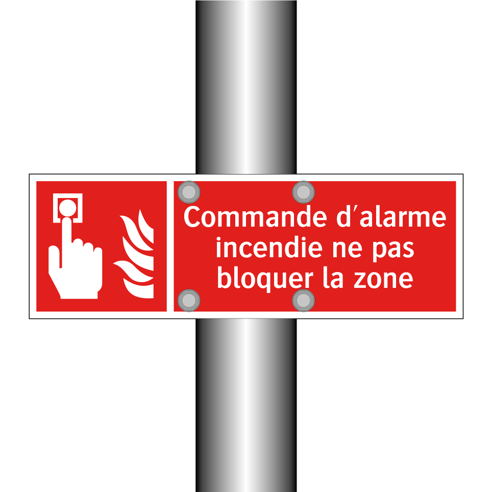 Panneau incendie avec le texte Commande d'alarme incendie ne pas bloquer la zone et une symbolique claire