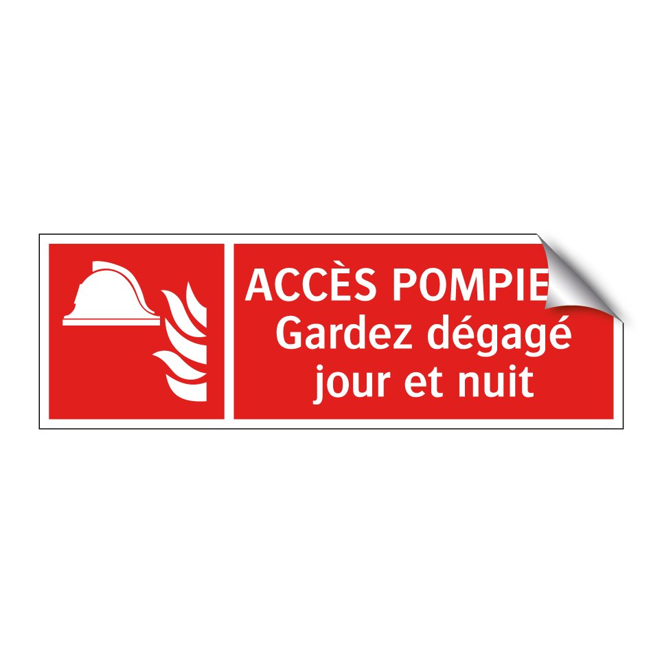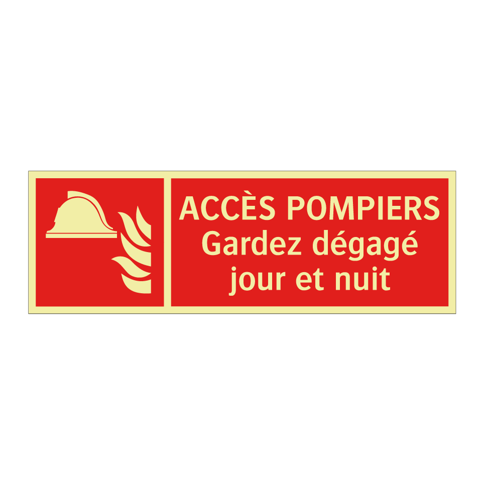Panneau incendie avec le texte ACCÈS POMPIERS Gardez dégagé jour et nuit et une symbolique claire