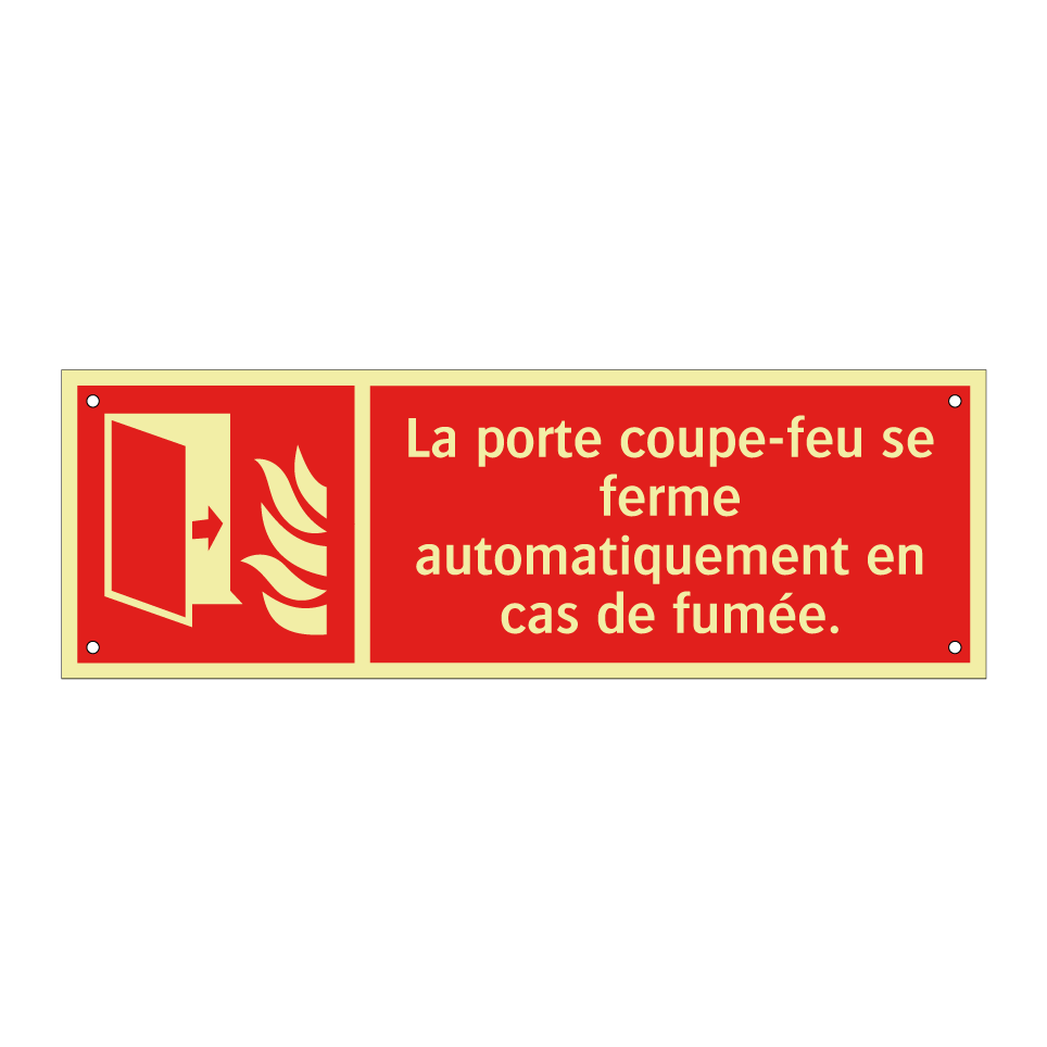 Panneau incendie avec le texte La porte coupe-feu se ferme automatiquement en cas de fumée. et une symbolique claire