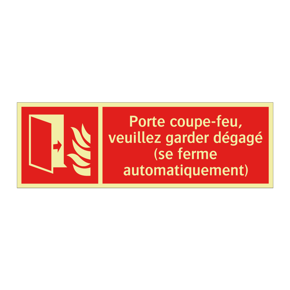 Panneau incendie avec le texte Porte coupe-feu, veuillez garder dégagé (se ferme automatiquement) et une symbolique claire