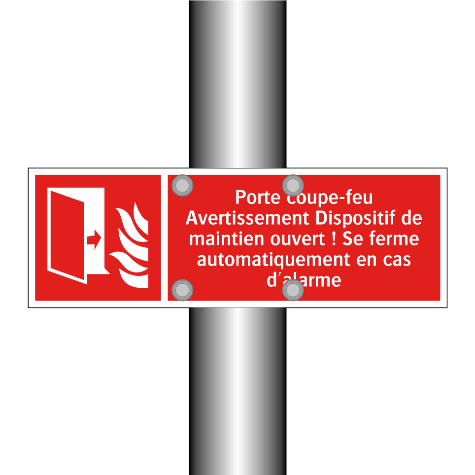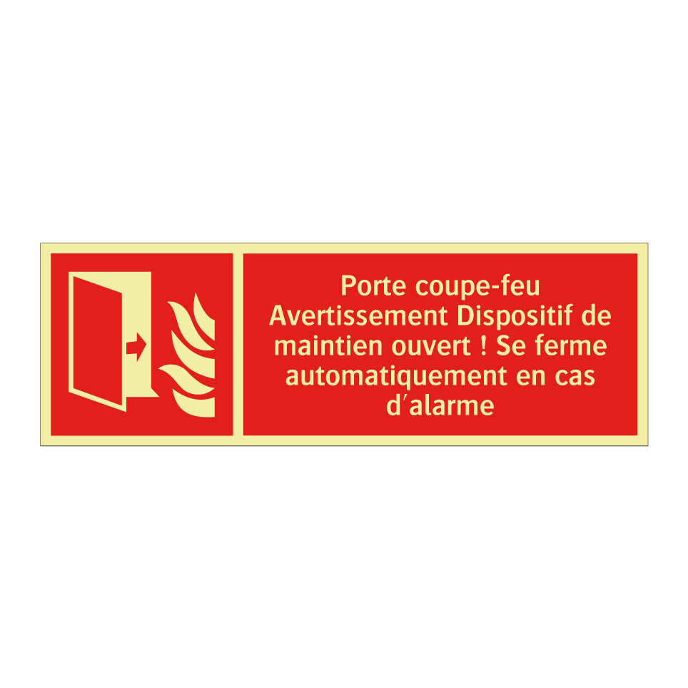 Panneau incendie avec le texte Porte coupe-feu Avertissement Dispositif de maintien ouvert ! Se ferme automatiquement en cas d'alarme et une symbolique claire