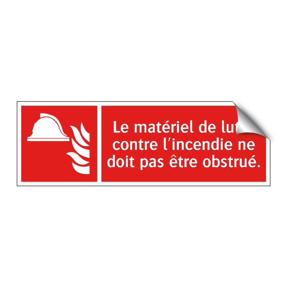 Panneau incendie avec le texte Le matériel de lutte contre l'incendie ne doit pas être obstrué. et une symbolique claire
