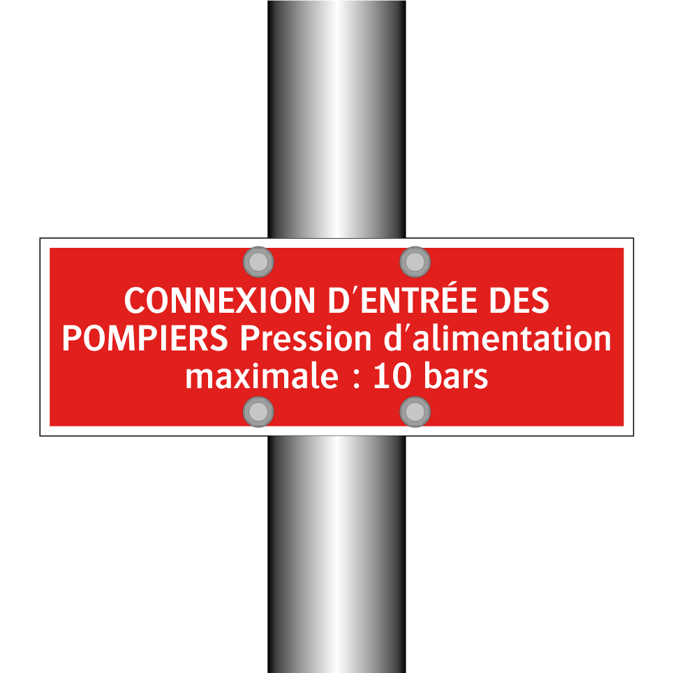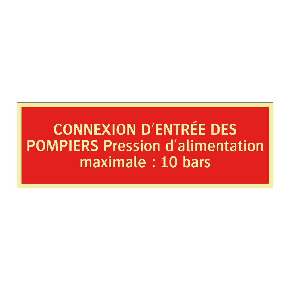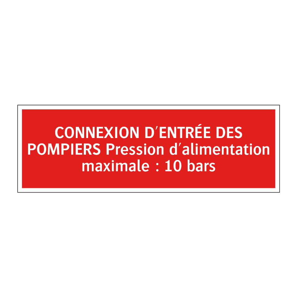 Panneau de signalisation incendie avec le texte CONNEXION D'ENTRÉE DES POMPIERS Pression d'alimentation maximale : 10 bars