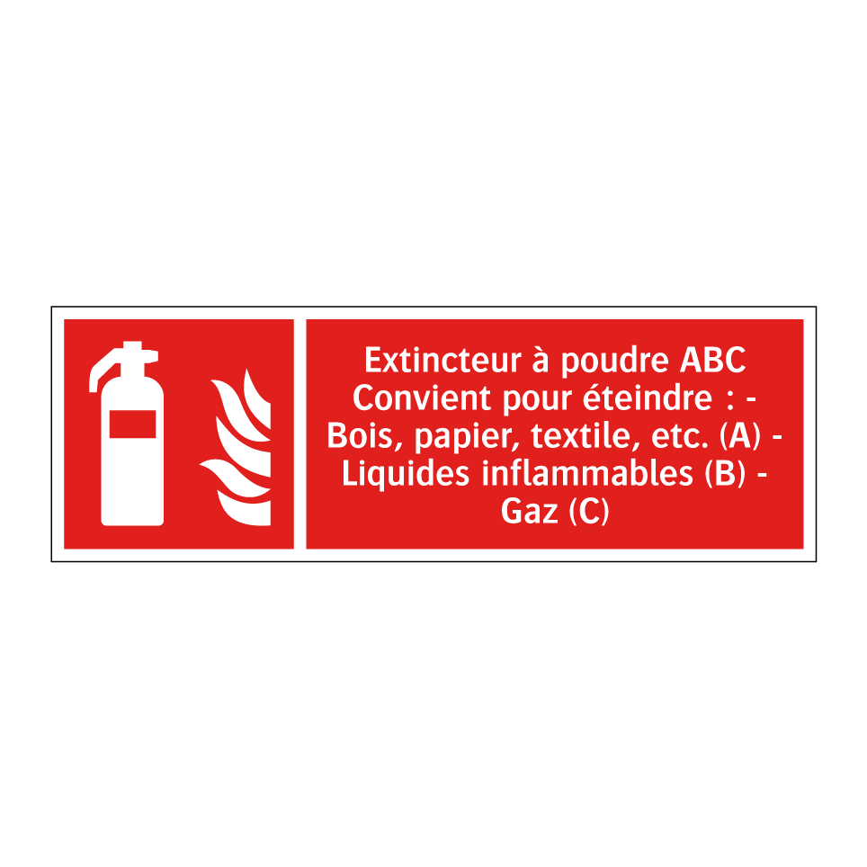 Panneau incendie avec le texte Extincteur à poudre ABC Convient pour éteindre : - Bois, papier, textile, etc. (A) - Liquides inflammables (B) - Gaz (C) et une symbolique claire