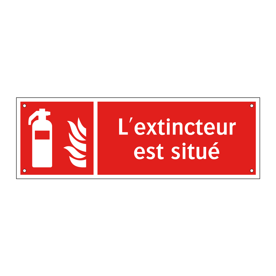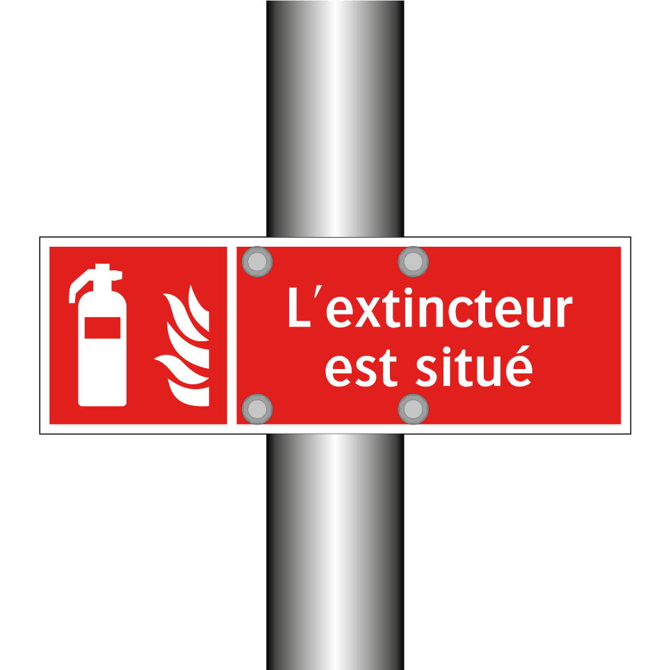Panneau incendie avec le texte L'extincteur est situé et une symbolique claire