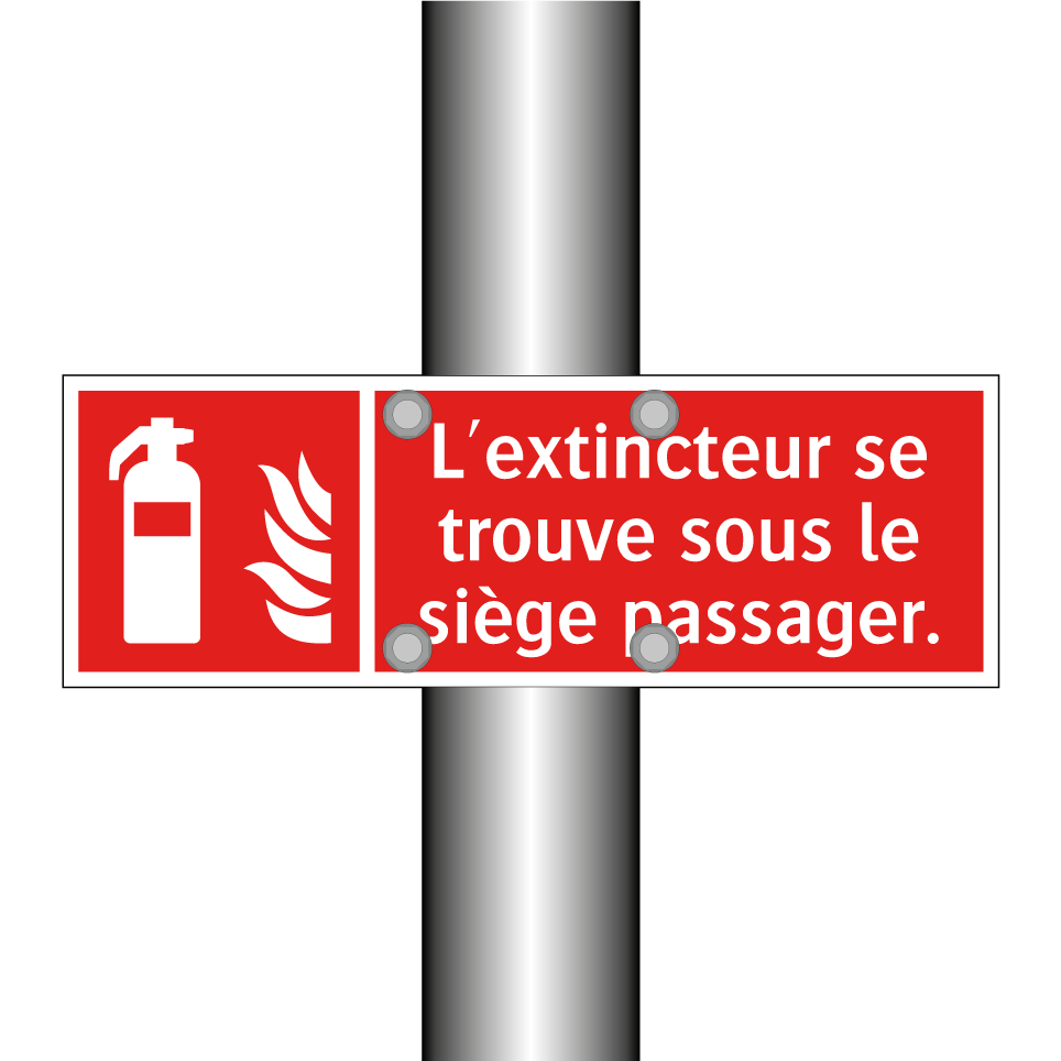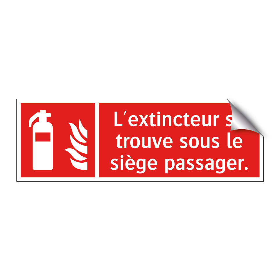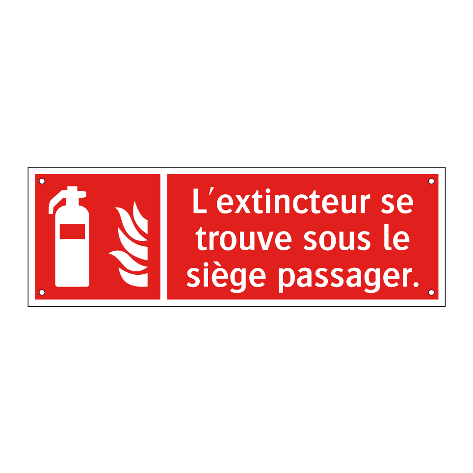 Panneau incendie avec le texte L'extincteur se trouve sous le siège passager. et une symbolique claire