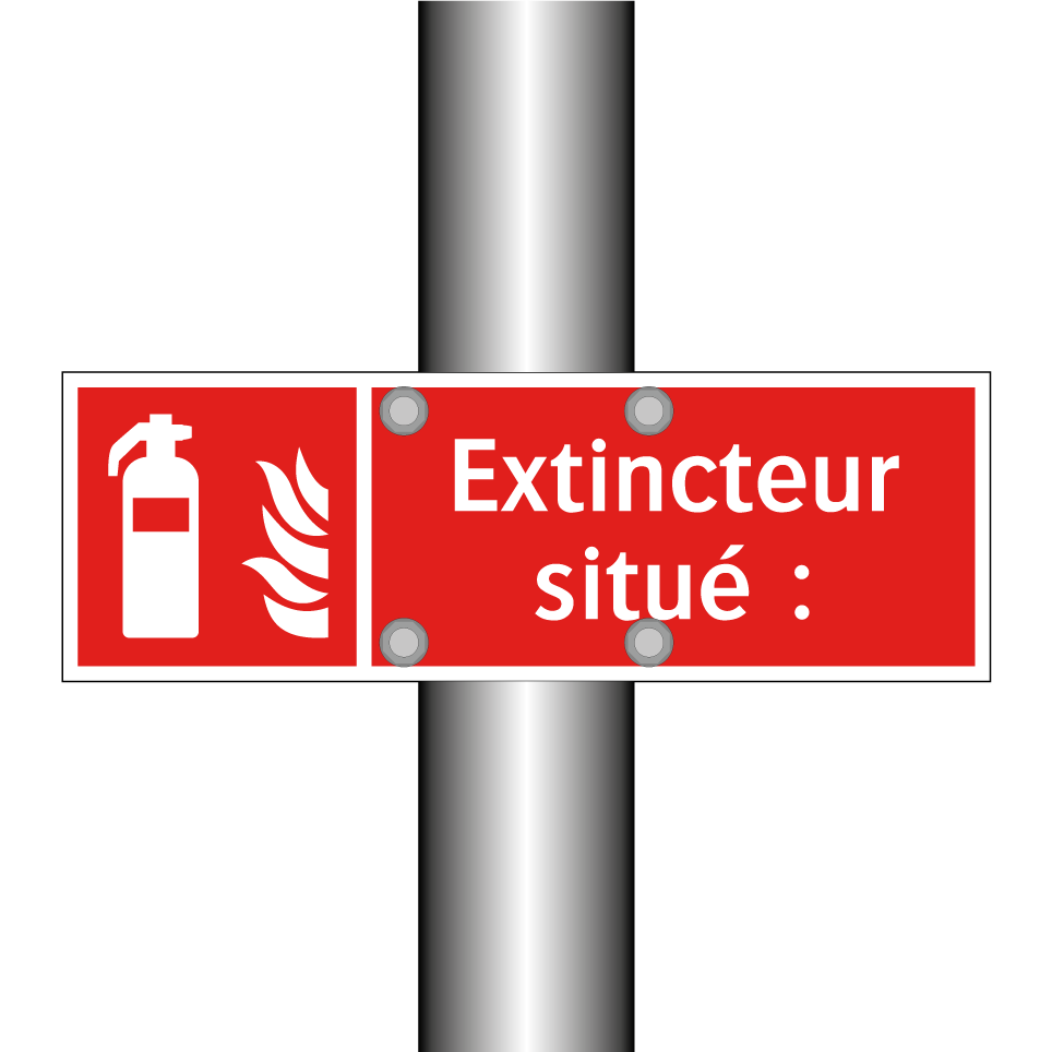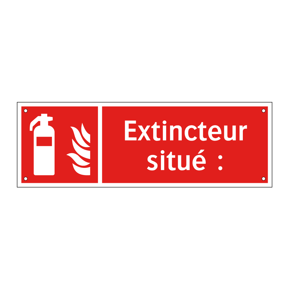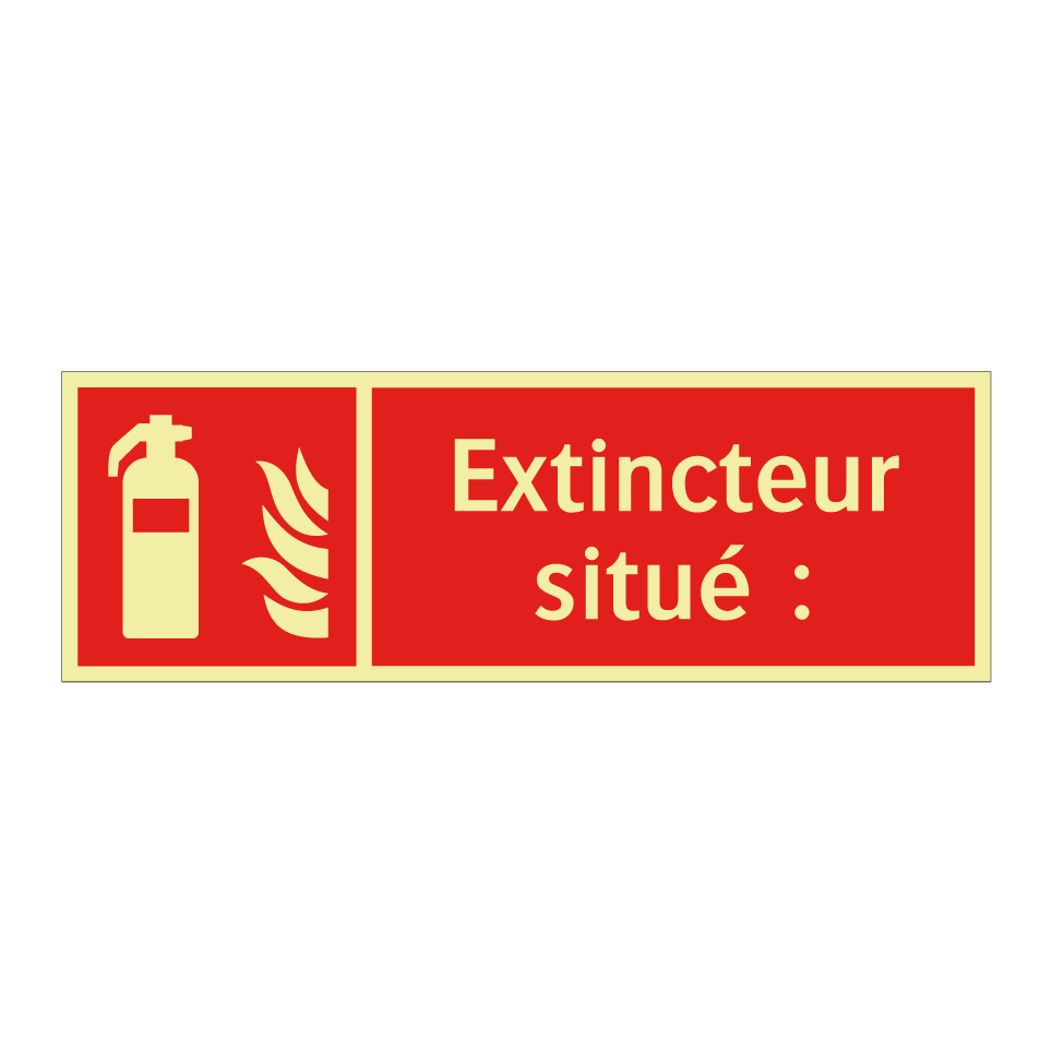 Panneau incendie avec le texte Extincteur situé : et une symbolique claire