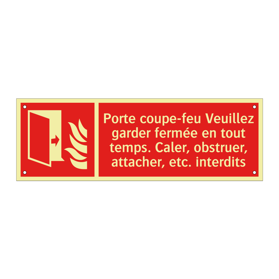 Panneau incendie avec le texte Porte coupe-feu Veuillez garder fermée en tout temps. Caler, obstruer, attacher, etc. interdits et une symbolique claire
