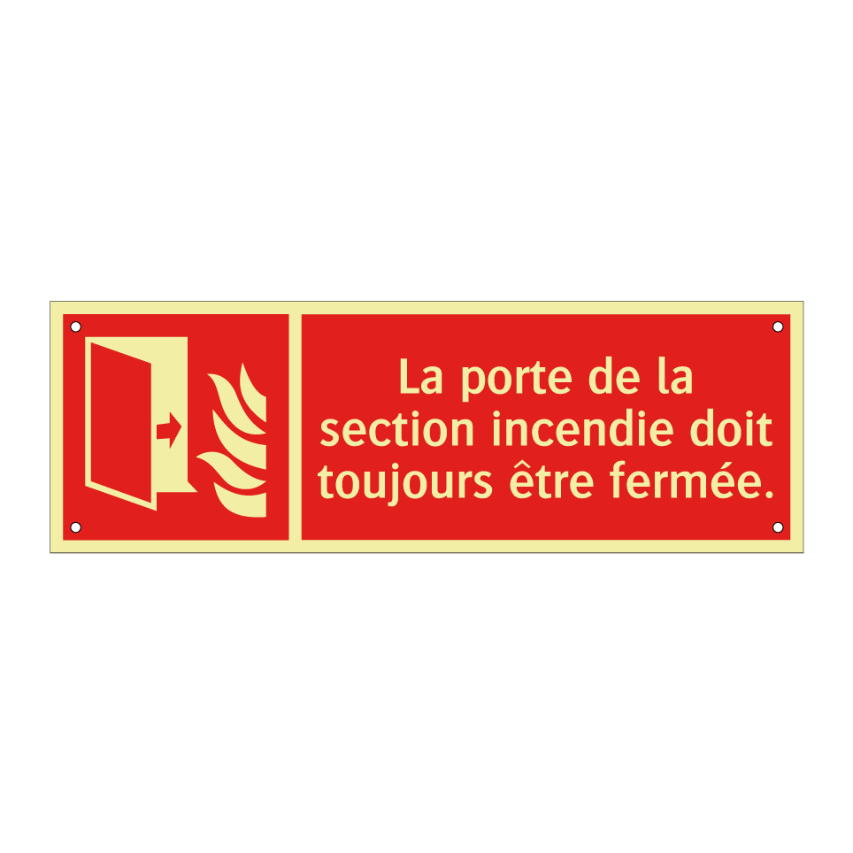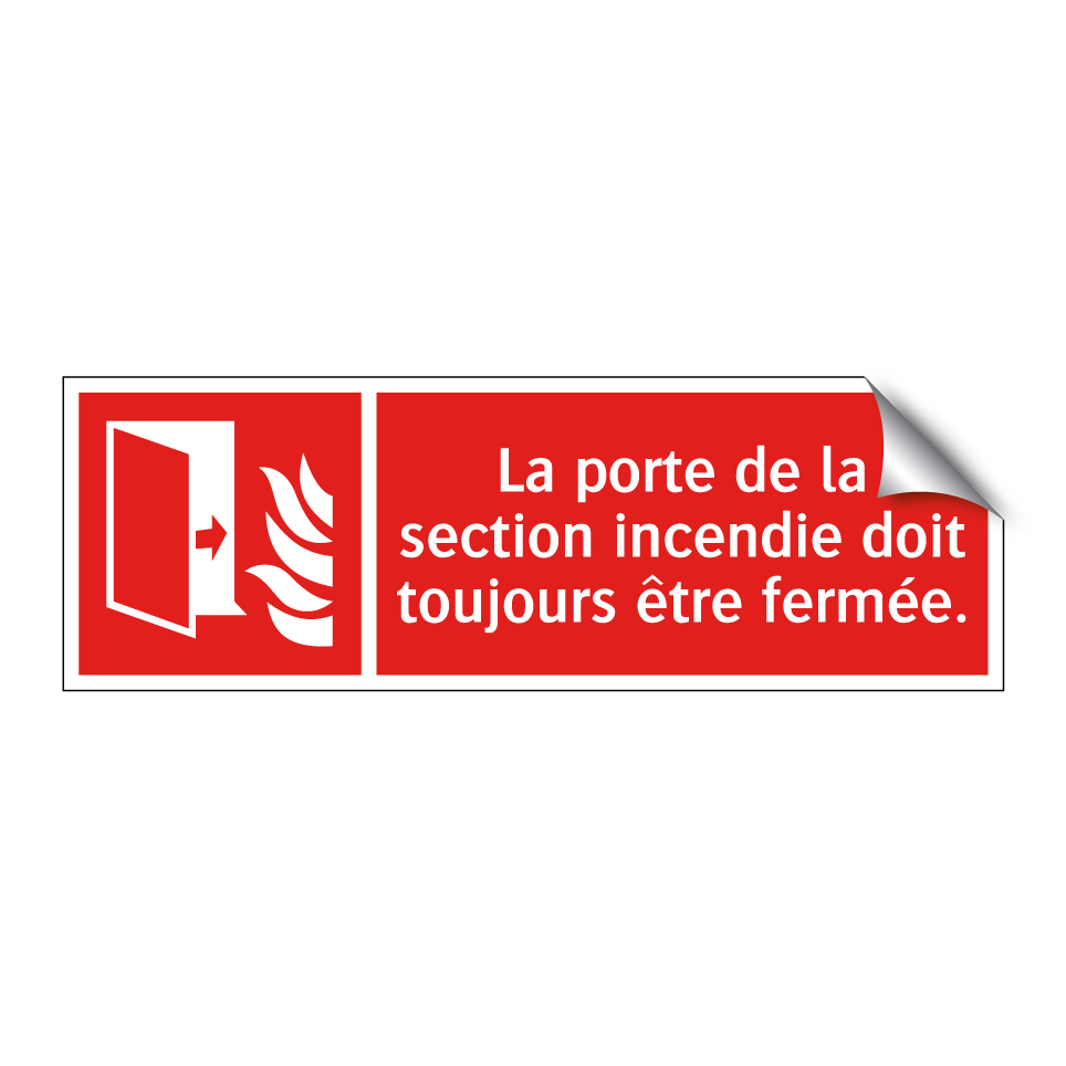 Panneau incendie avec le texte La porte de la section incendie doit toujours être fermée. et une symbolique claire