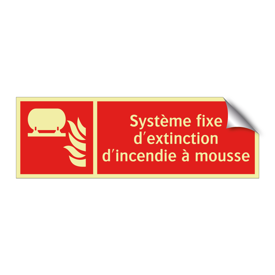Panneau incendie avec le texte Système fixe d'extinction d'incendie à mousse et une symbolique claire