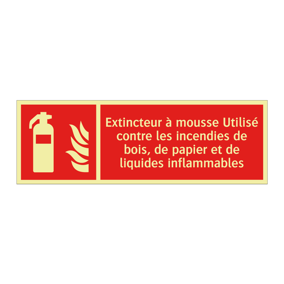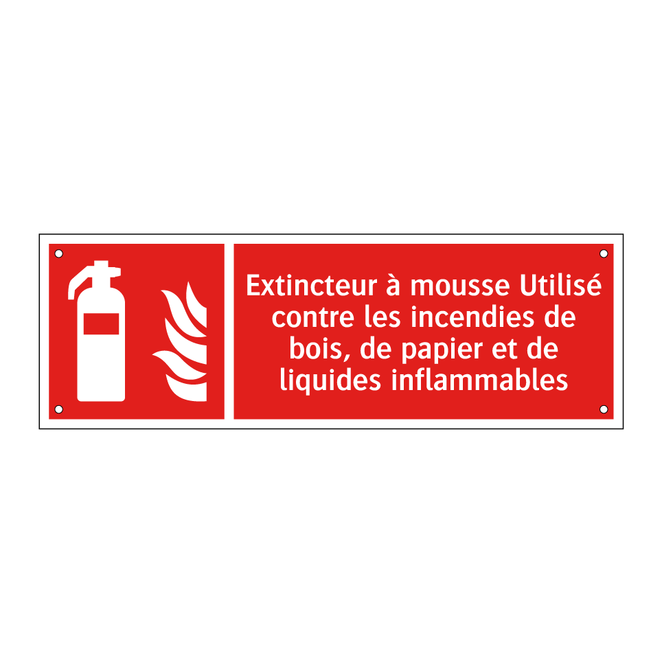 Panneau incendie avec le texte Extincteur à mousse Utilisé contre les incendies de bois, de papier et de liquides inflammables et une symbolique claire