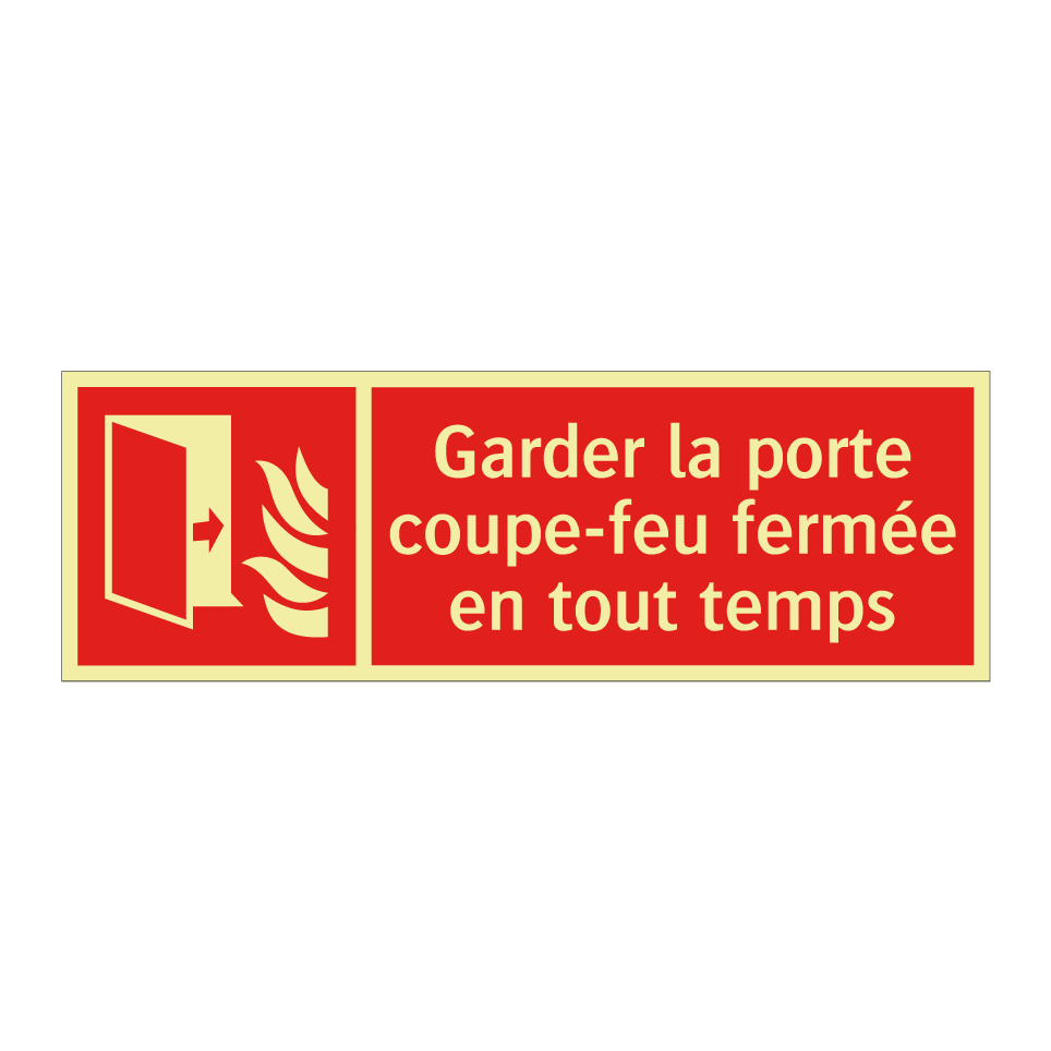 Panneau incendie avec le texte Garder la porte coupe-feu fermée en tout temps et une symbolique claire